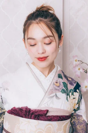 ピンクのアイシャドウにピンクのリップを合わせて可憐な印象に。髪型を再度アップにし組紐の色味を重ね襟に合わせることで統一感のあるスタイリングになります。