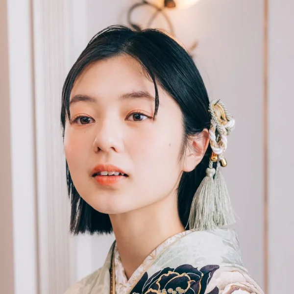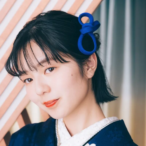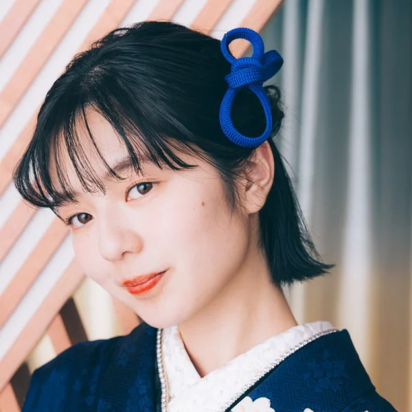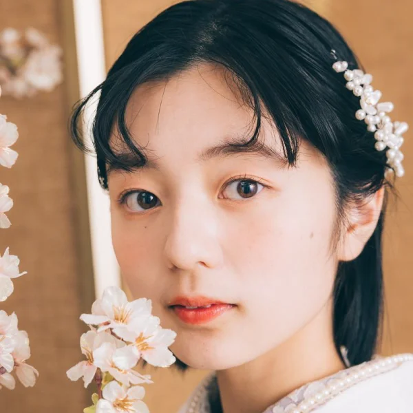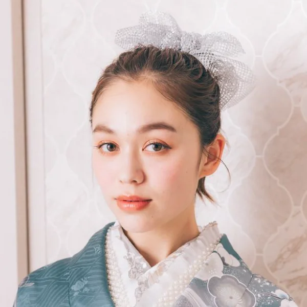 アイシャドウをピンクにし、組紐リボンの髪飾りを取り入れることで大人可愛い印象に。前髪をシースルーバングにすることで柔らかいスタイリングになります。