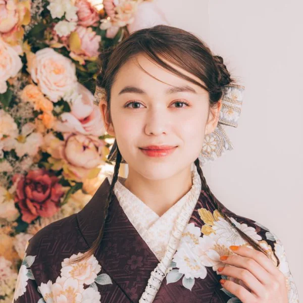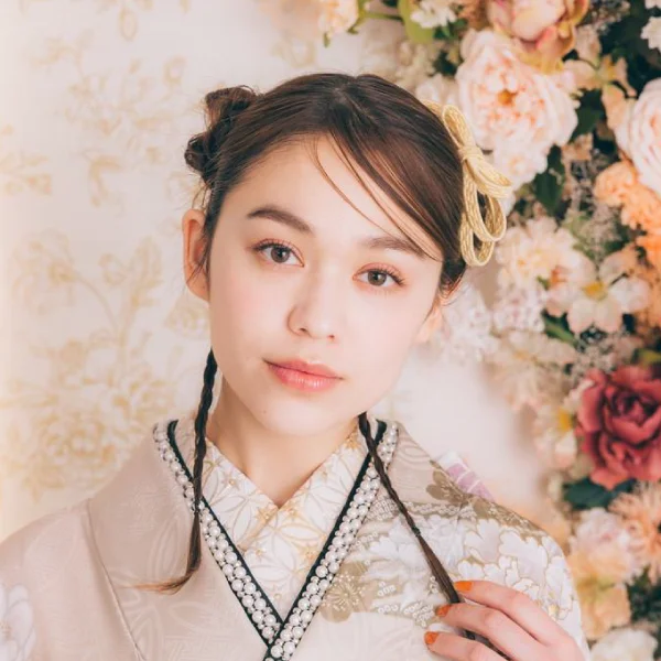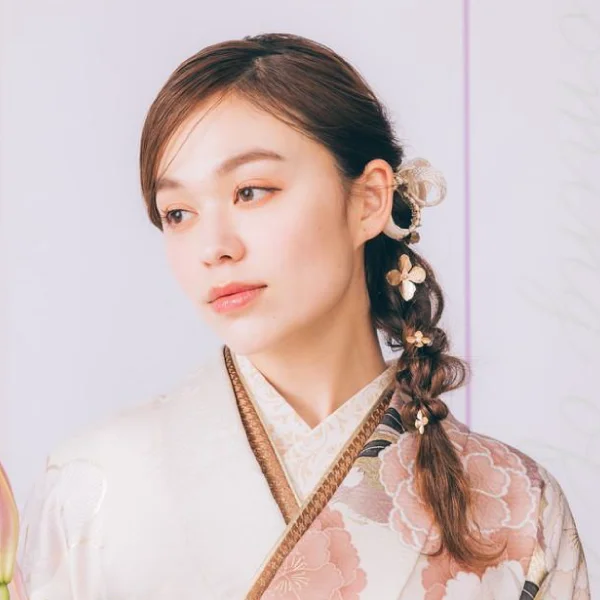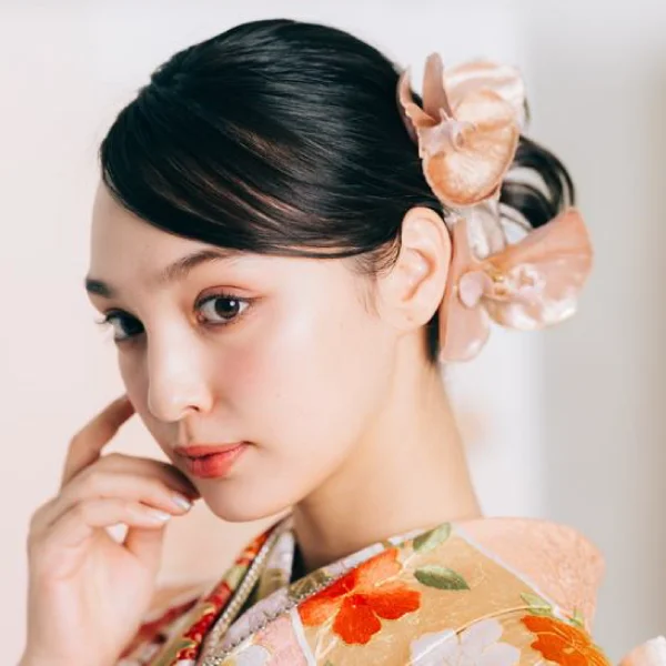 ピンクのアイシャドウにピンクのチークで可愛らしい印象に。落ち着いた赤味ブラウンの振袖に髪飾りの刺繡リボンを追加することで、甘さ×上品さを演出したスタイリングになります。