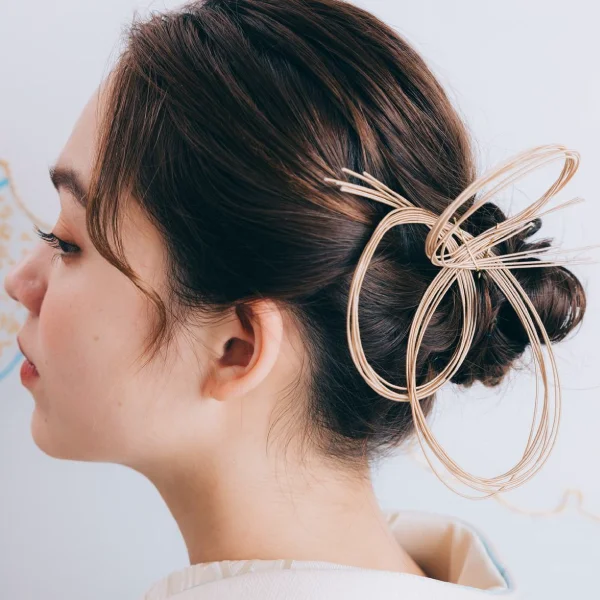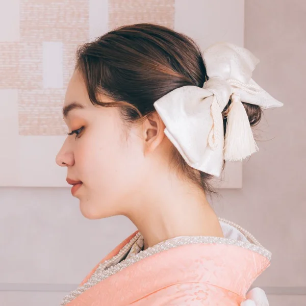 ブラウンのアイシャドウに赤のリップを合わせて洗練された印象に。ホワイトカラーの振袖に合わせた大きめの水引の髪飾りを合わせて洗練された大人のスタイリングになります。