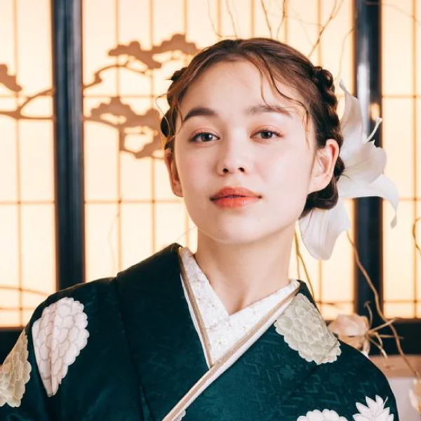 ピンクのアイシャドウに赤いリップを合わせてエレガントな印象に。上品な振袖に百合の髪飾りを合わせて洗練されたスタイリングになります。