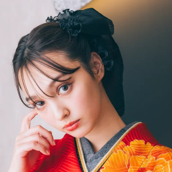 濃ゆめのブラウンのアイシャドウに赤のリップを合わせてクールな印象に。赤の振袖にブラックフリルを合わせてシースルーバングにすることでスタイリッシュで愛らしいスタイリングになります。