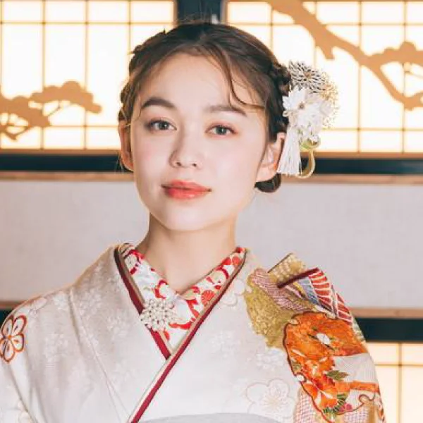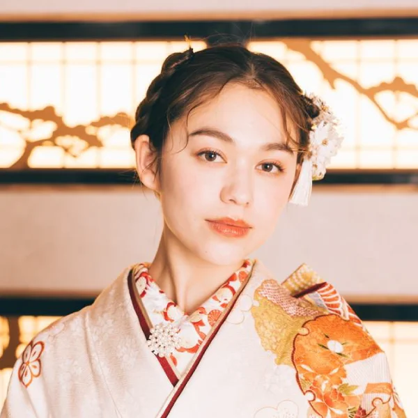 オレンジブラウンのアイシャドウに落ち着いた色味のリップで上品で可愛らしい印象に。振袖が落ち着いた色味なので上品さをより引き立てるスタイリングになります。