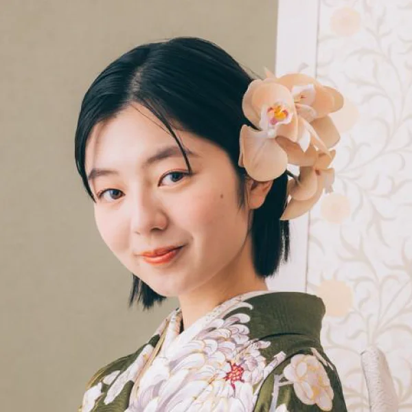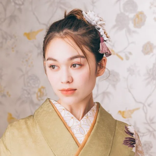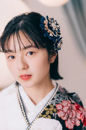 落ち着いた色味のピンクのアイシャドウに、赤味のリップで気品あふれる印象に。つまみ細工の髪飾りも振袖の色味を合わせて、より洗練された美しさを引き立てるスタイリングになります。
