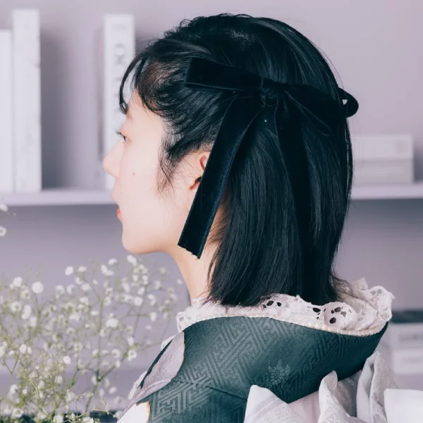 落ち着いた緑色系の振袖には、ベロアのリボンで可愛さをプラス。重ね襟にレースを追加することで大人っぽく魅力的な可愛らしさを演出したスタイリングになります、