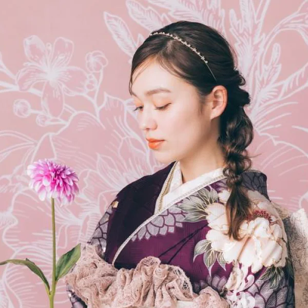 ピンクブラウンのアイシャドウにオレンジのリップを合わせて可愛らしい印象に。紫色の振袖に、編みおろしスタイルとパールのカチューシャを合わせて優美なスタイリングになります。