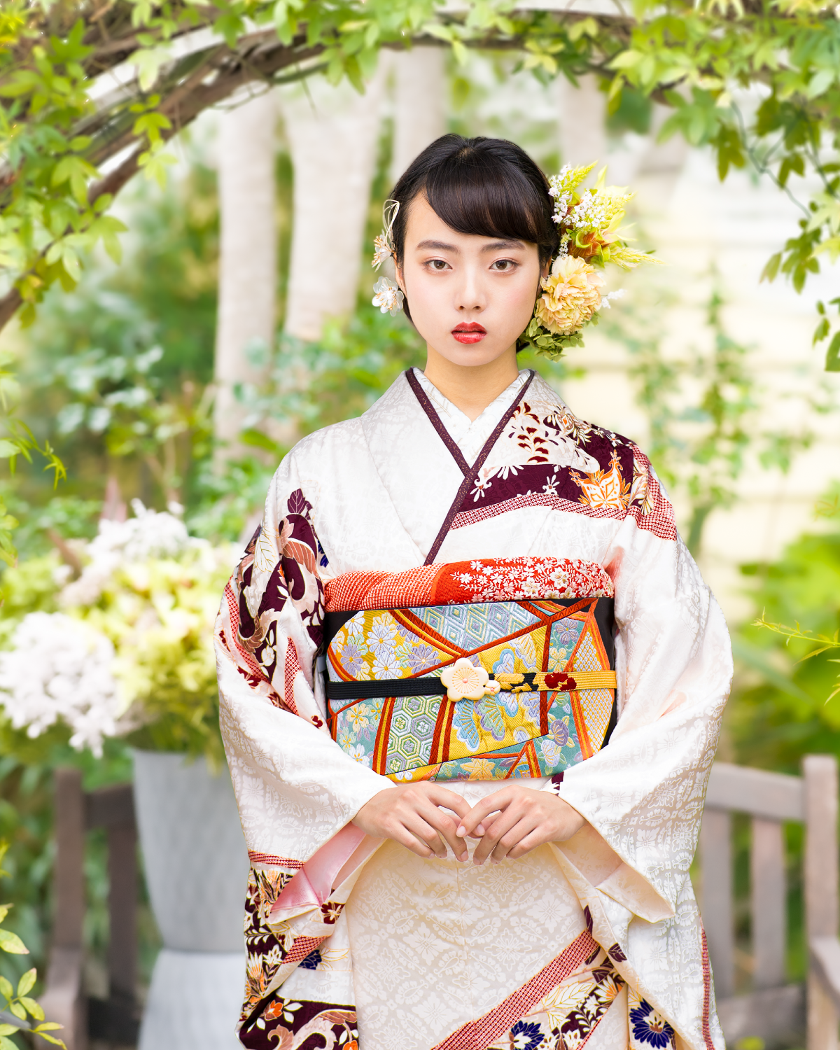 お嬢さまの好みに合わせて、帯・伊達衿・半衿・帯揚げや帯締めなど、一つひとつの小物をスタイリストと一緒にお選びいただけます。組合せは自由自在!髪飾りも店内で販売いたしますので、お楽しみいただきながら、美しい全身トータルコーディネートが叶います。