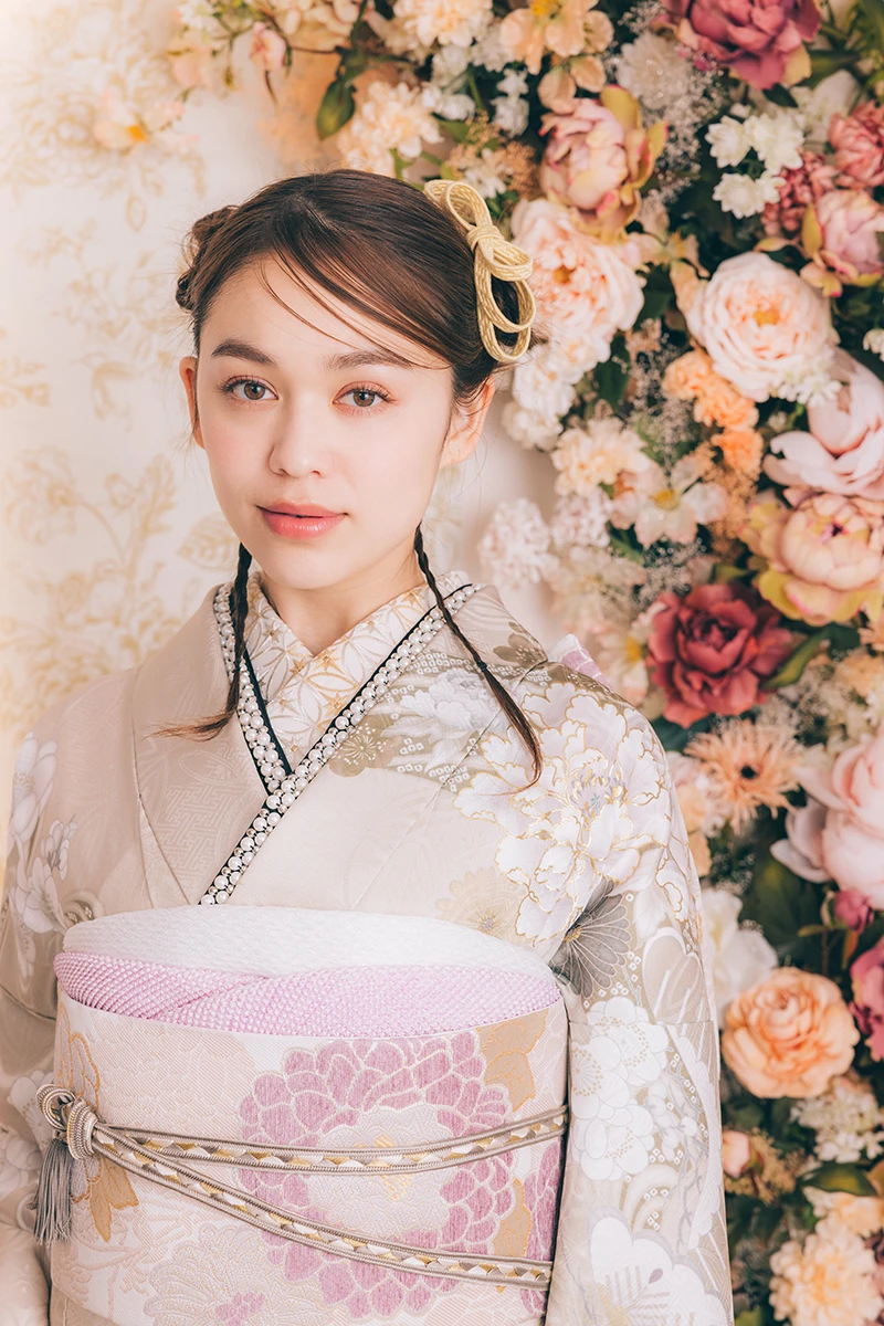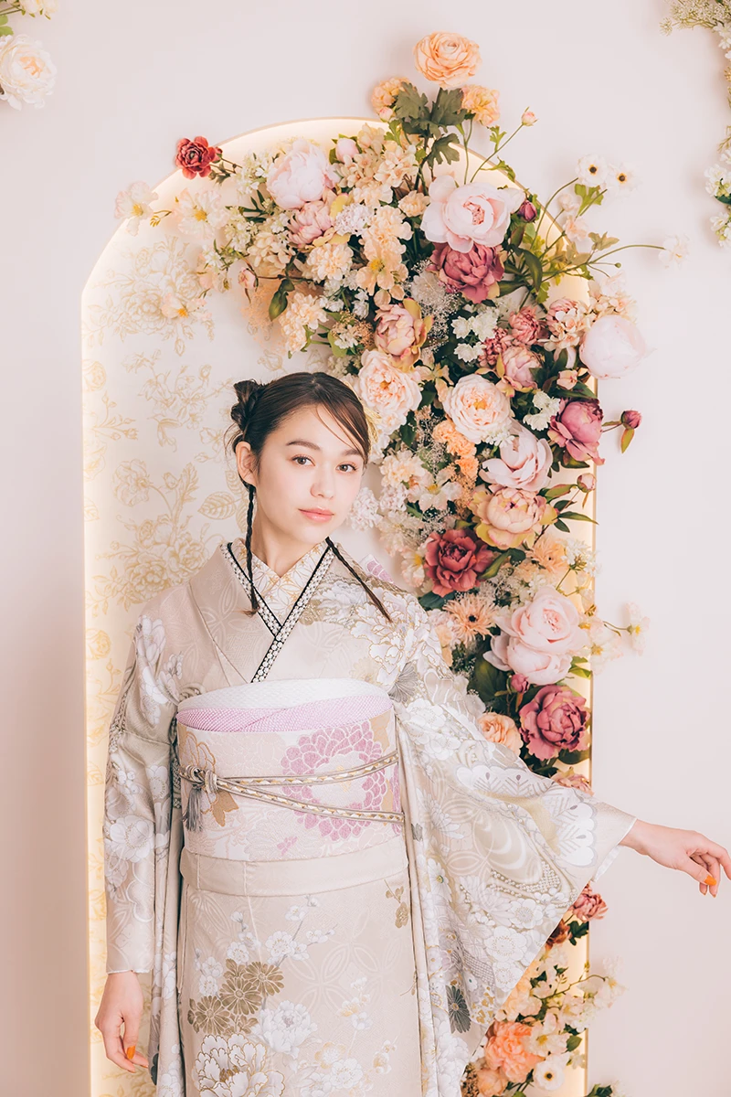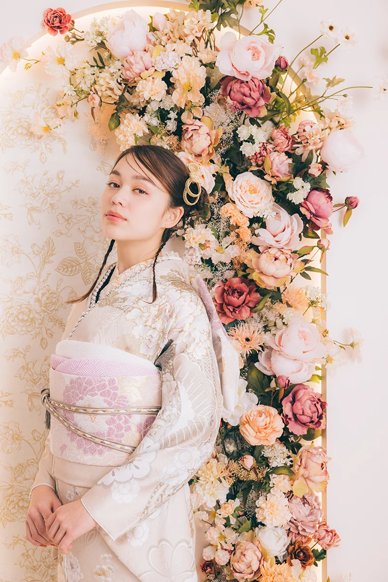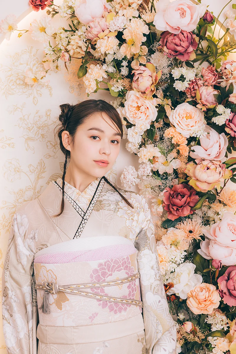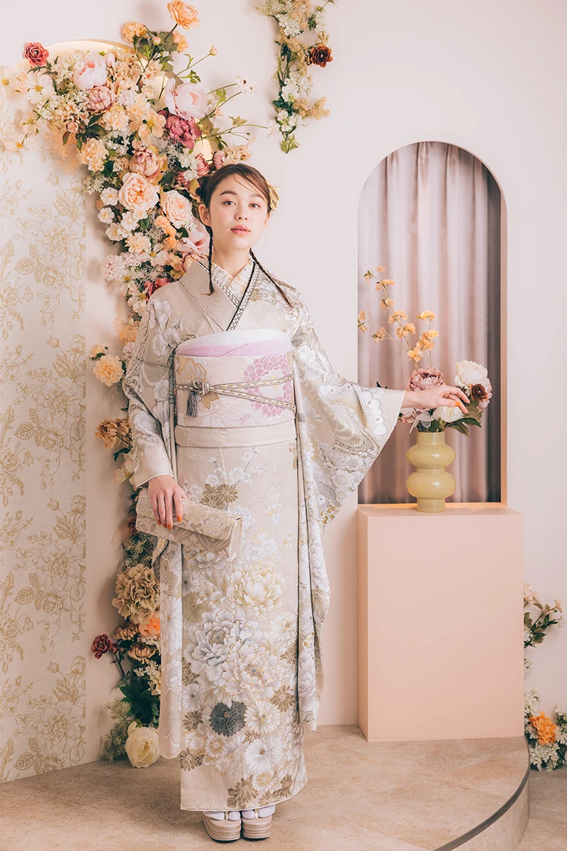 アイボリーのニュアンスカラーが、やわらかな印象を与える一着。四季折々の花々のデザインが、華やかさを引き立てます。