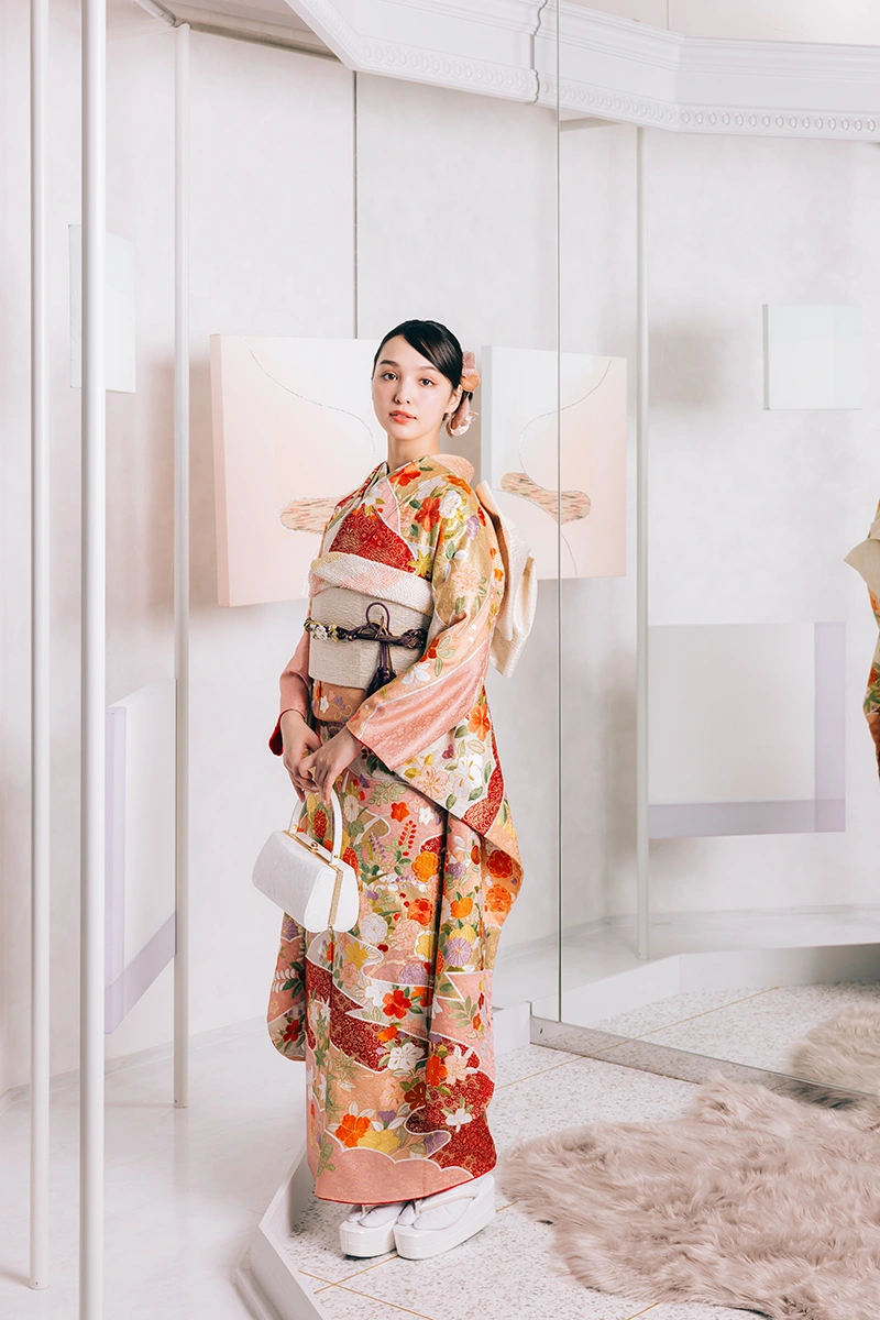 赤地に四季折々の花々をあしらった、上品で華やかな振袖。古典柄ならではの落ち着いた気品と、可憐な印象が魅力の一着です。