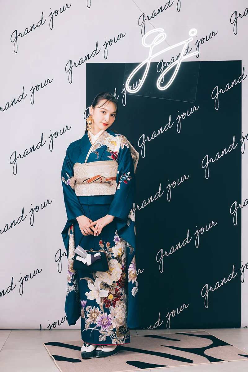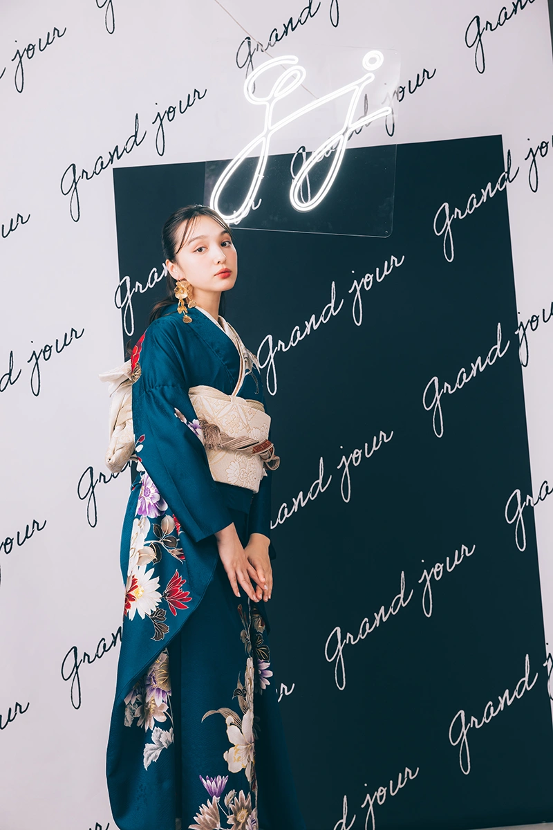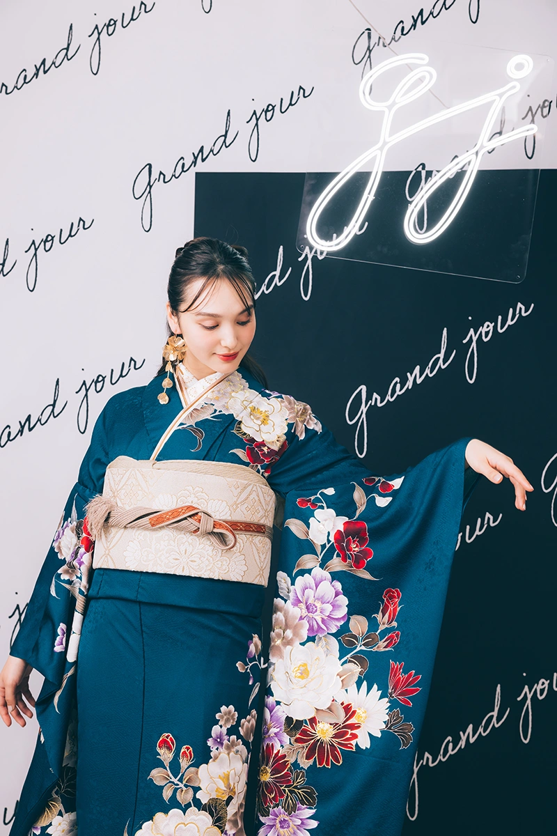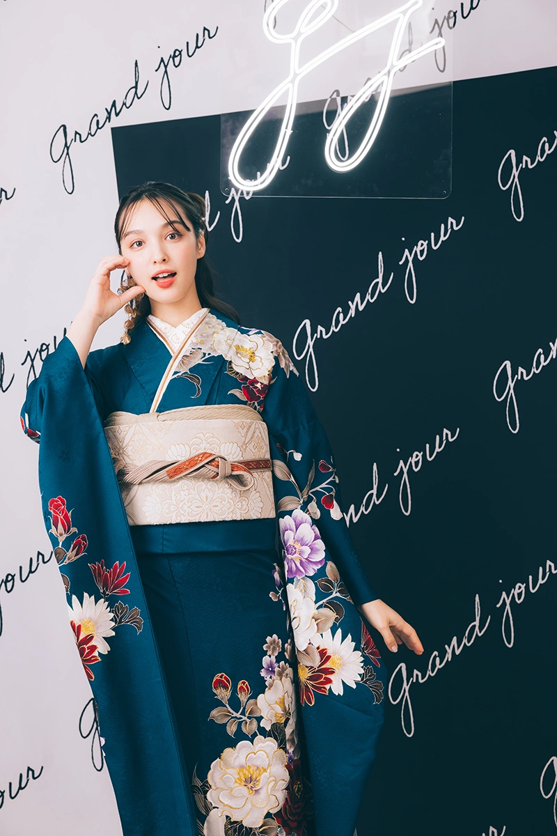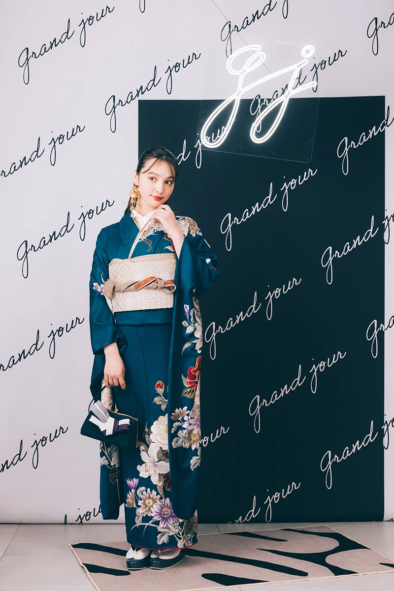 伝統色・藍色の地に、白い百合や牡丹の花々をあしらった一着。花々の華やかな彩りがアクセントとなり、落ち着きと気品が漂います。