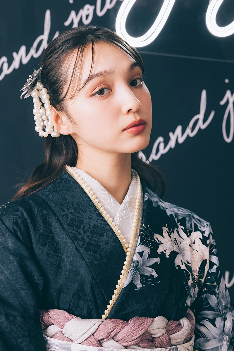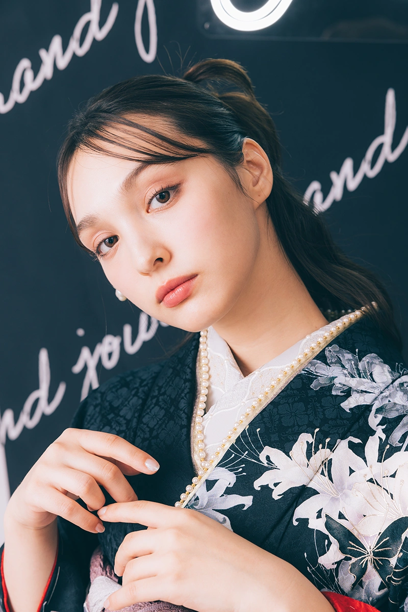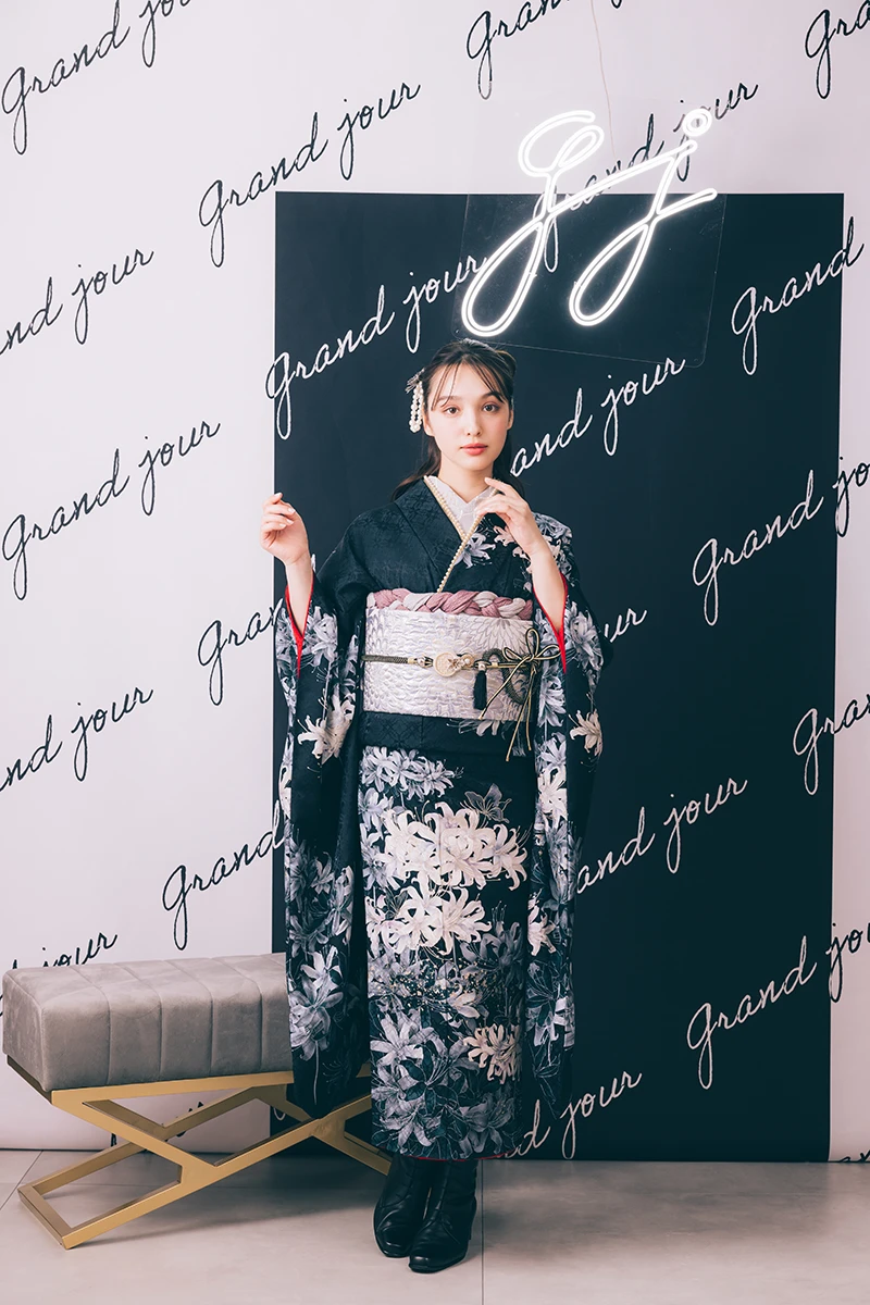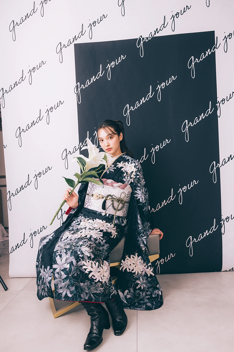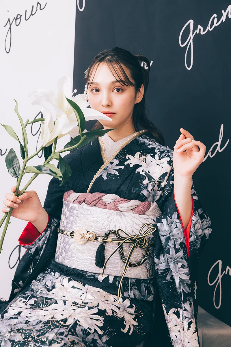 黒地に金箔を施した百合の柄が際立つ、モノトーンの振袖。百合の花がクールな印象を引き立てます。足元にブーツを合わせ、モダンで個性的なスタイルに。
