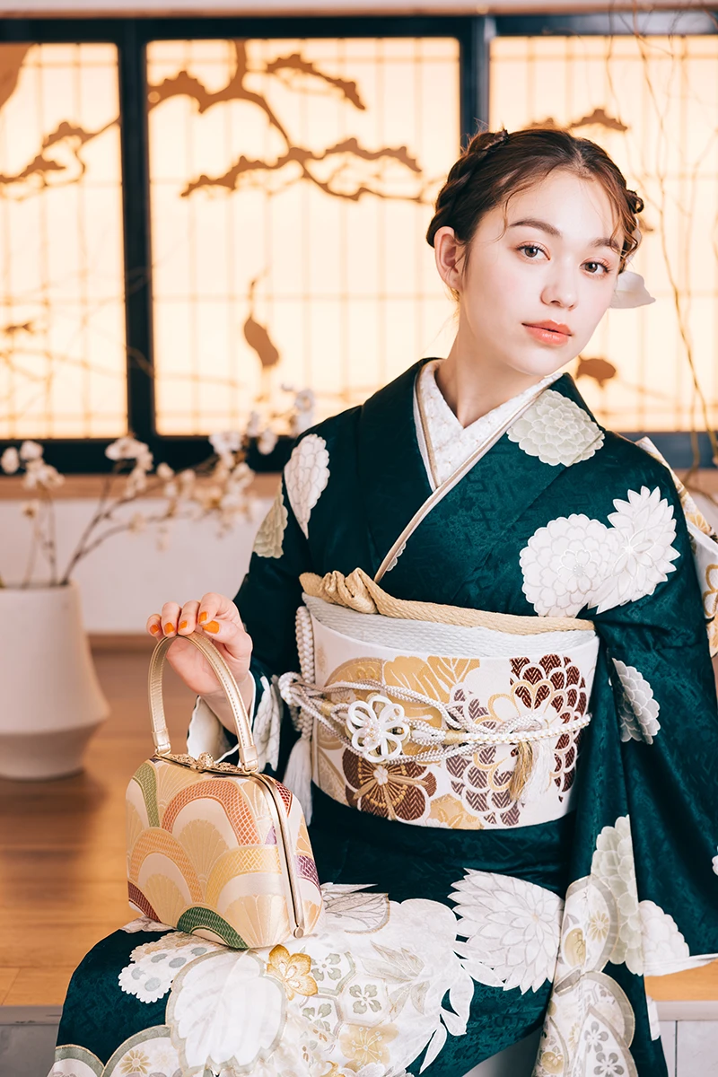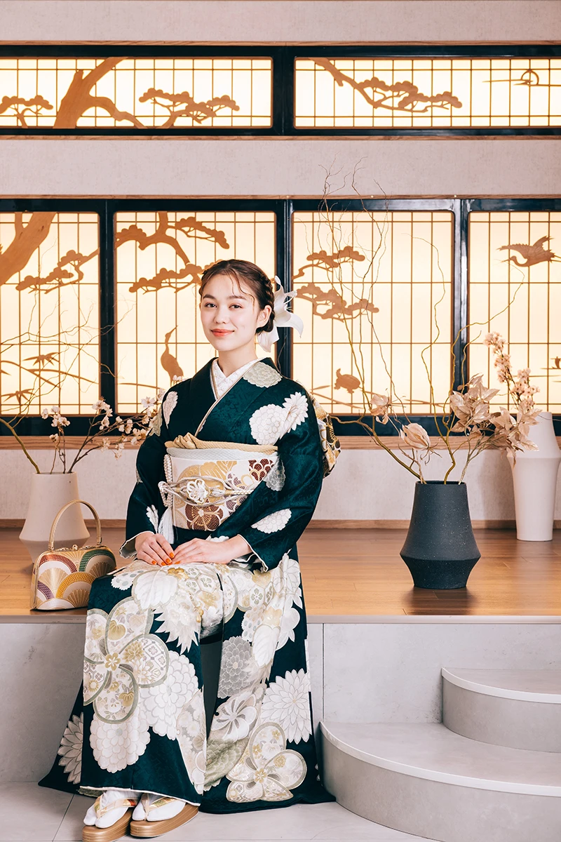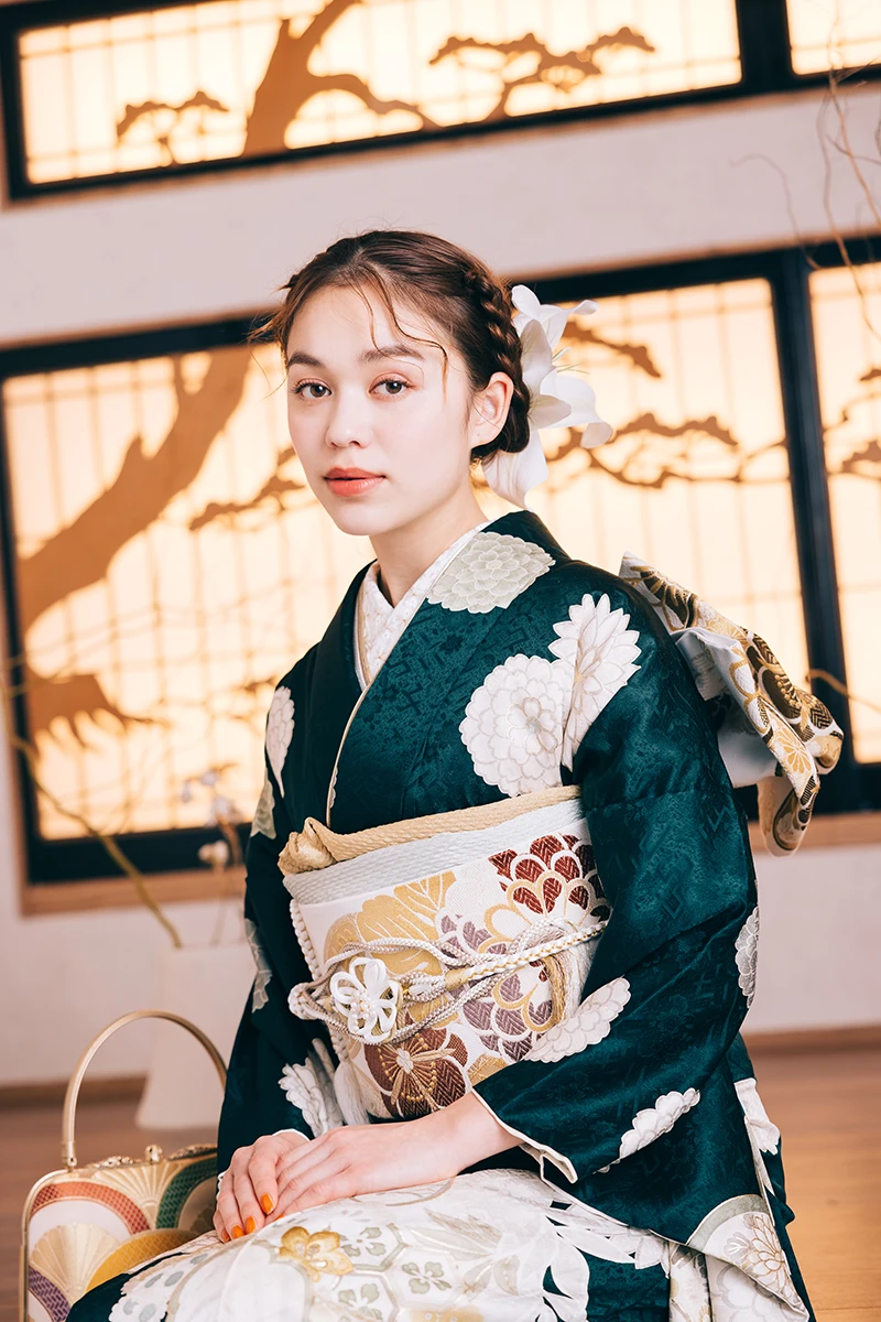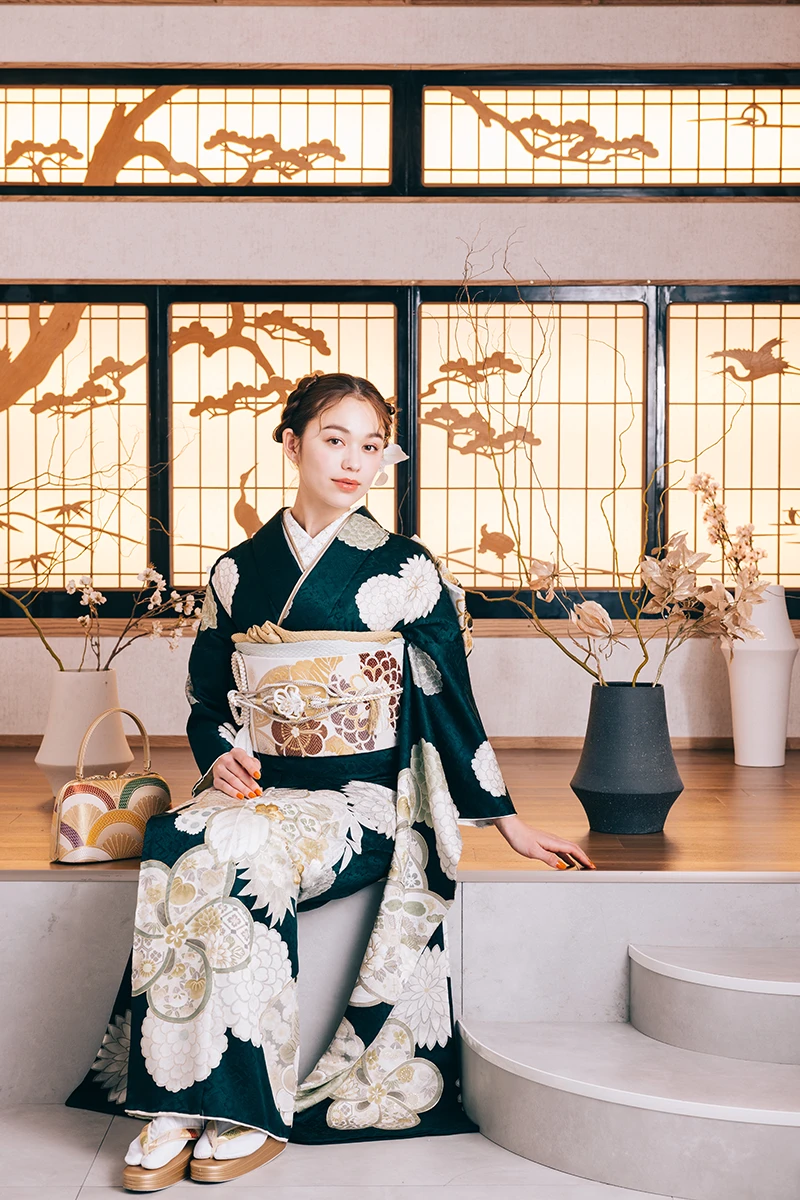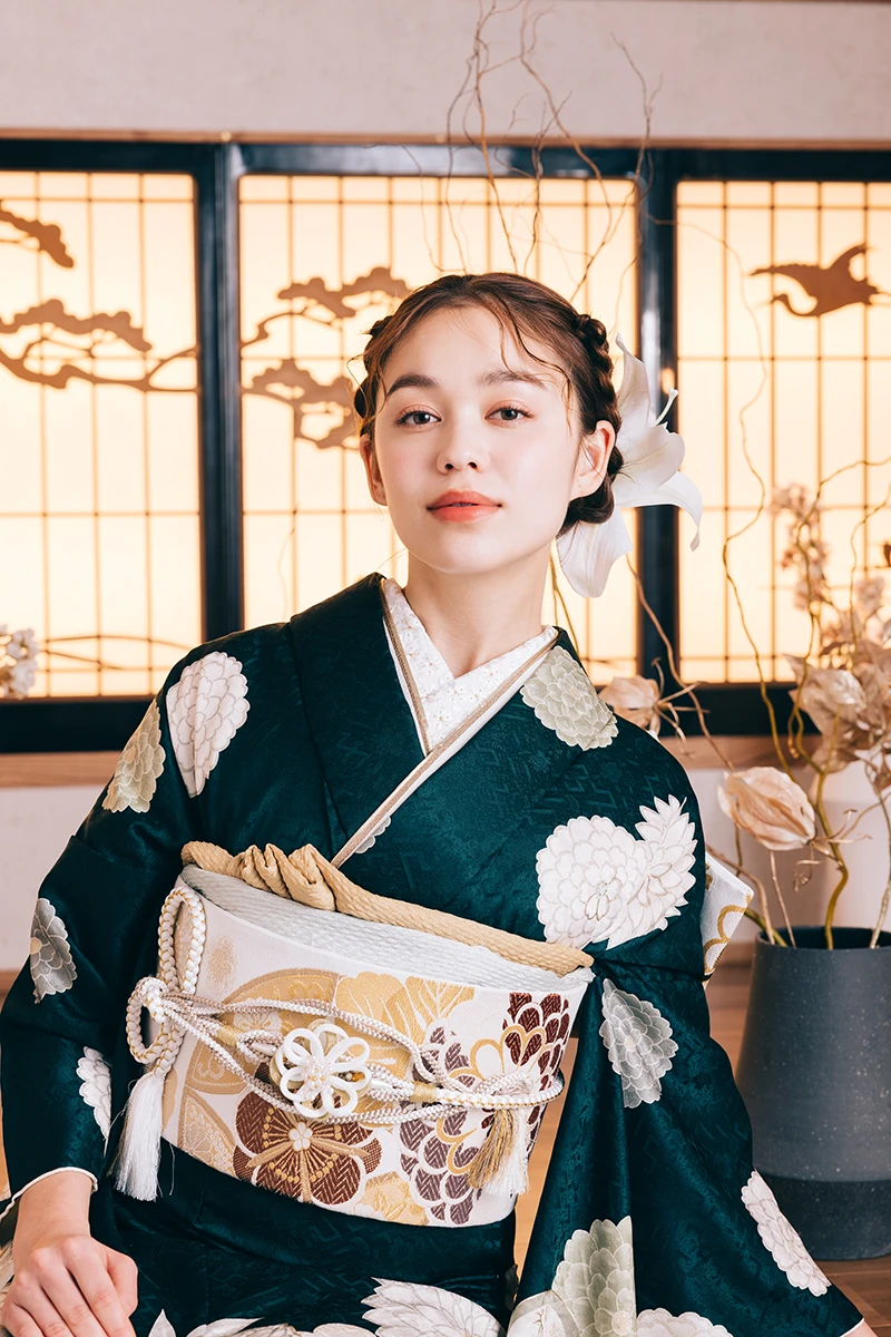 ダイナミックに描かれた、梅と菊の柄が目を引く一着。凛とした雰囲気が、クールで個性的な美しさを引き立てます。