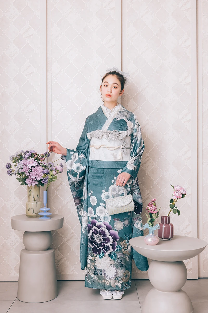 藍ねず色と呼ばれる、青みを帯びたグレイッシュカラーは日本の伝統色のひとつ。花びらに刺繍を施し、立体感と動きのある個性的な一着です。上品で洗練された存在感が際立ちます。