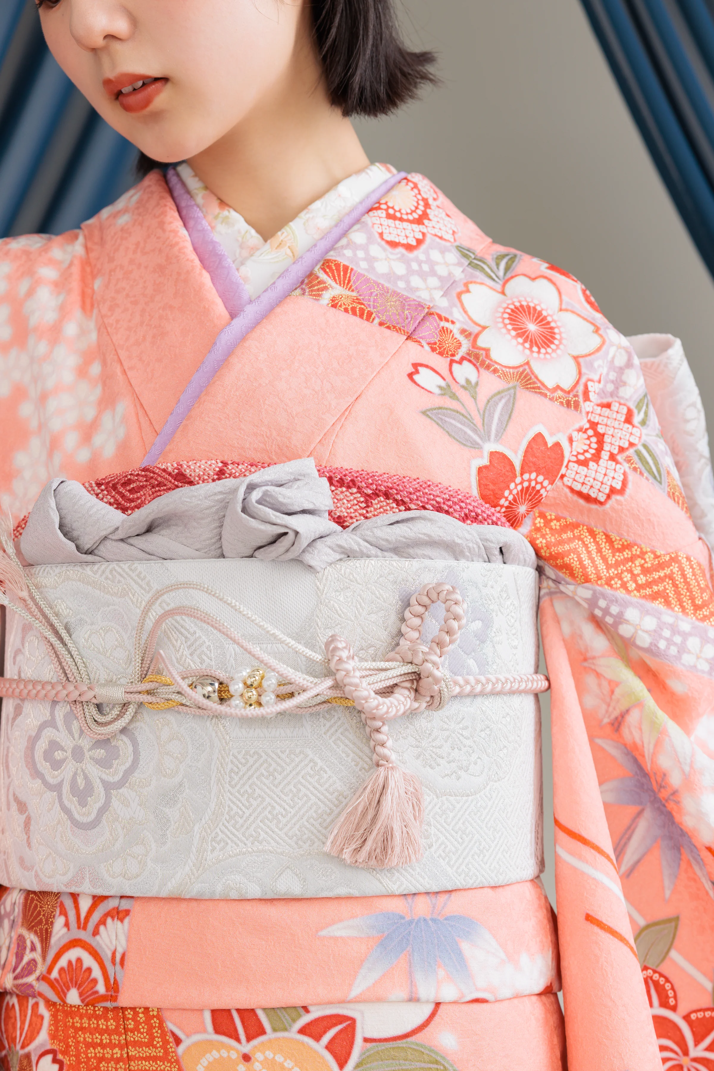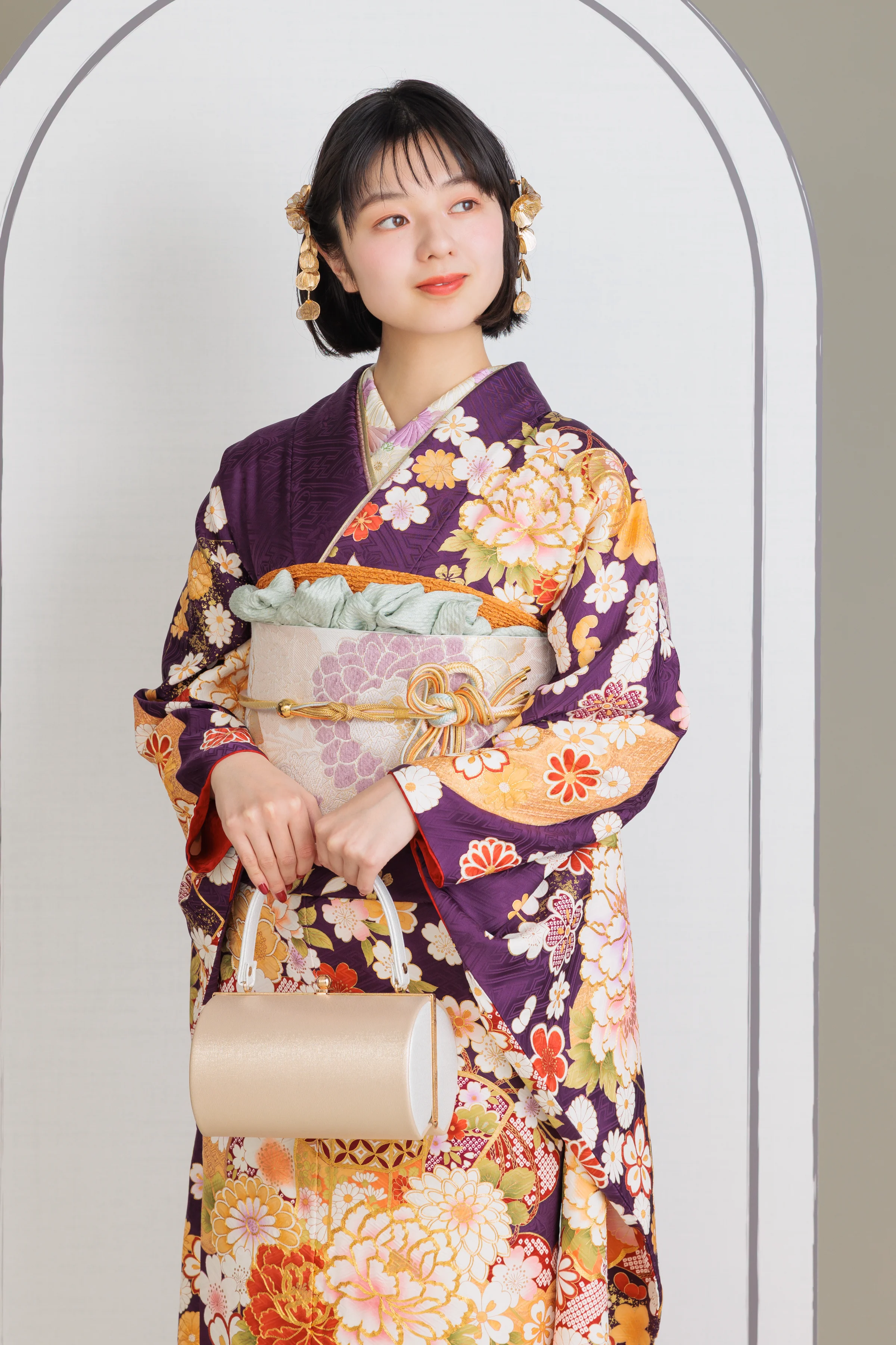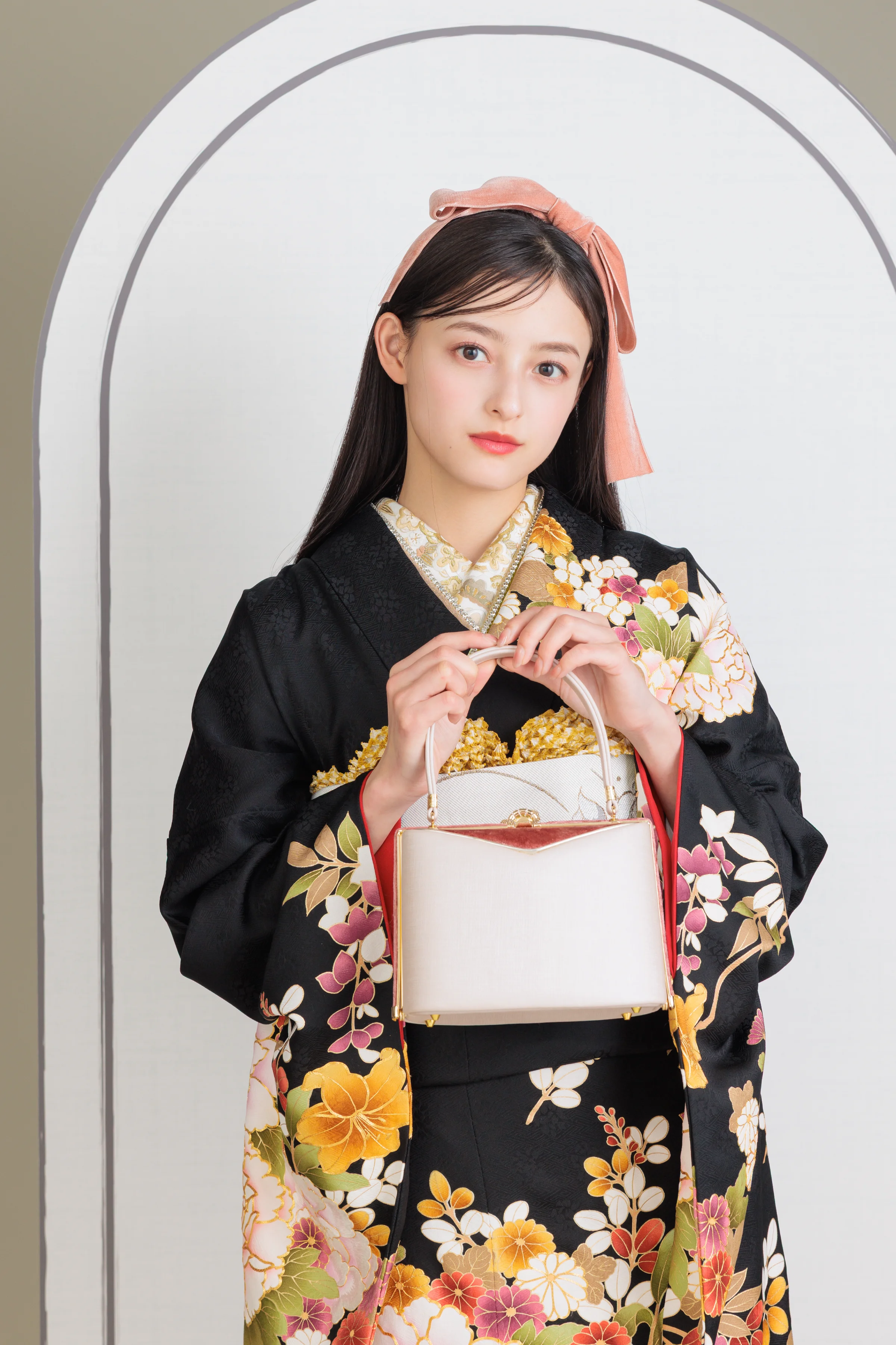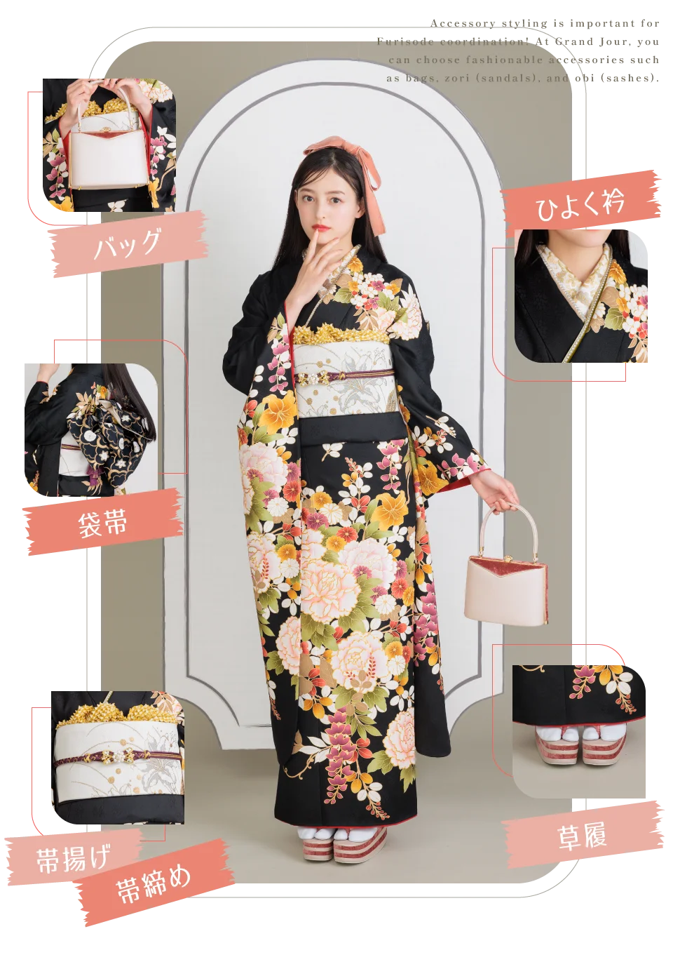 振袖コーディネートには小物スタイリングが重要!グランジュールなら、バッグや草履、帯などお洒落な小物をお選びいただけます。
