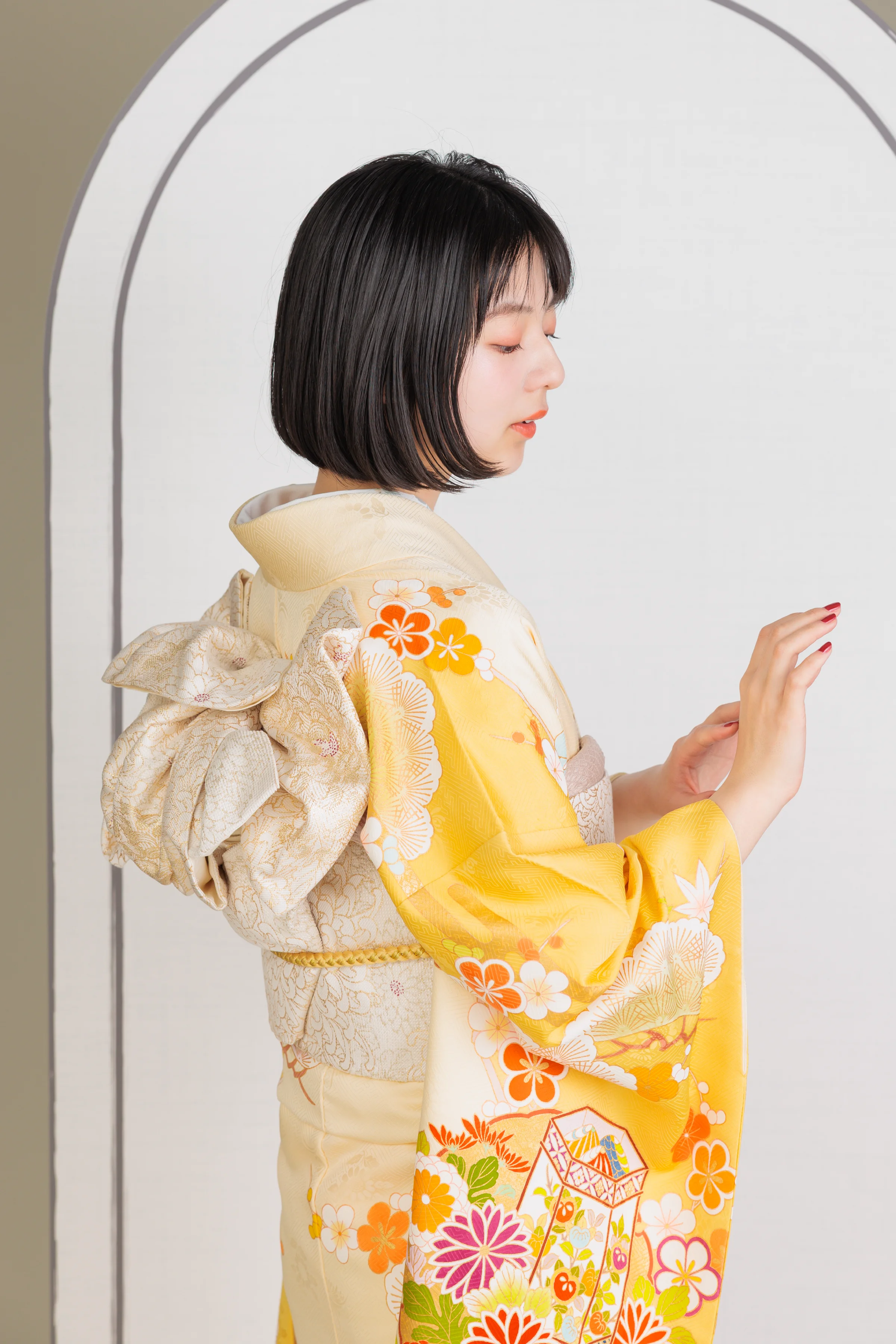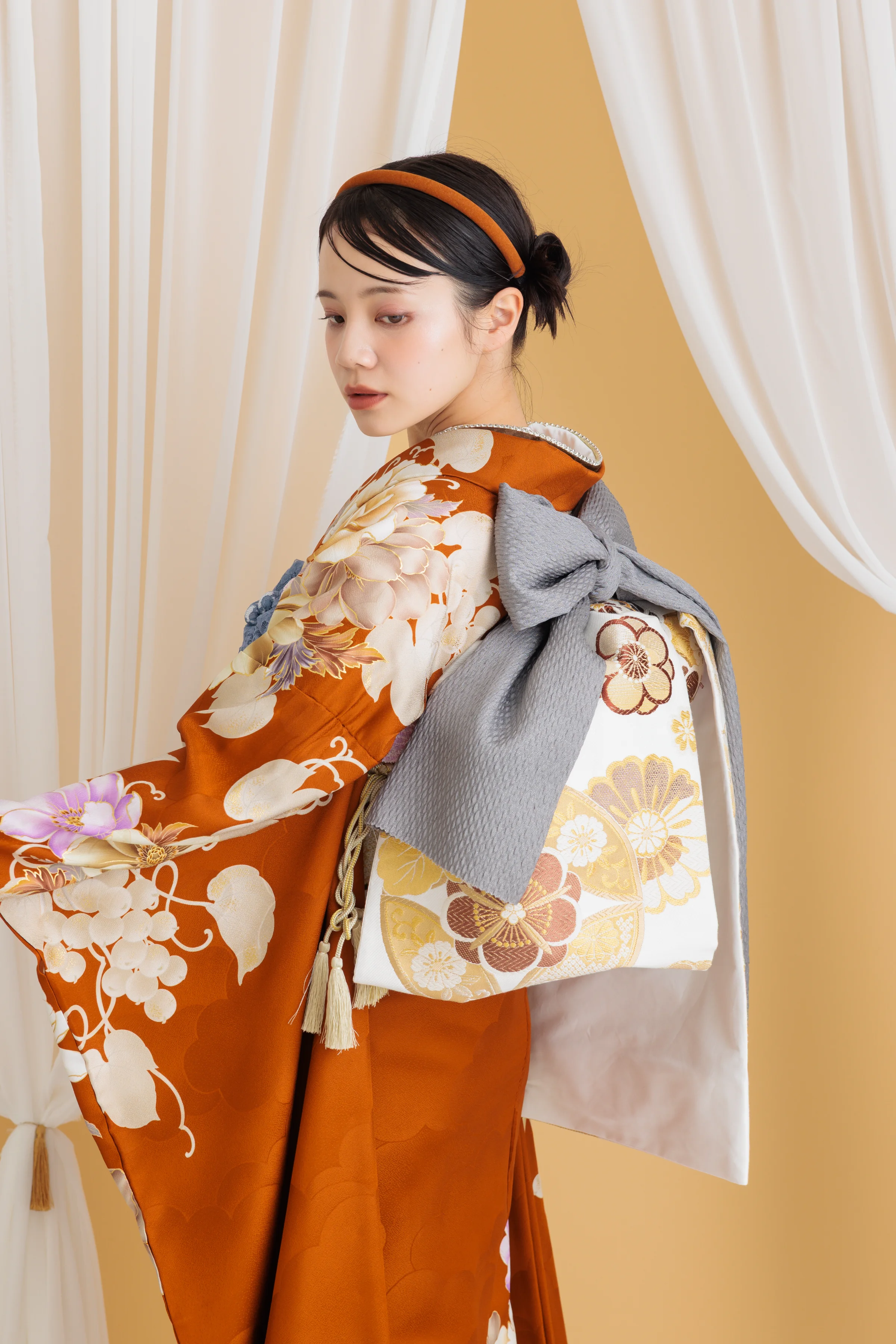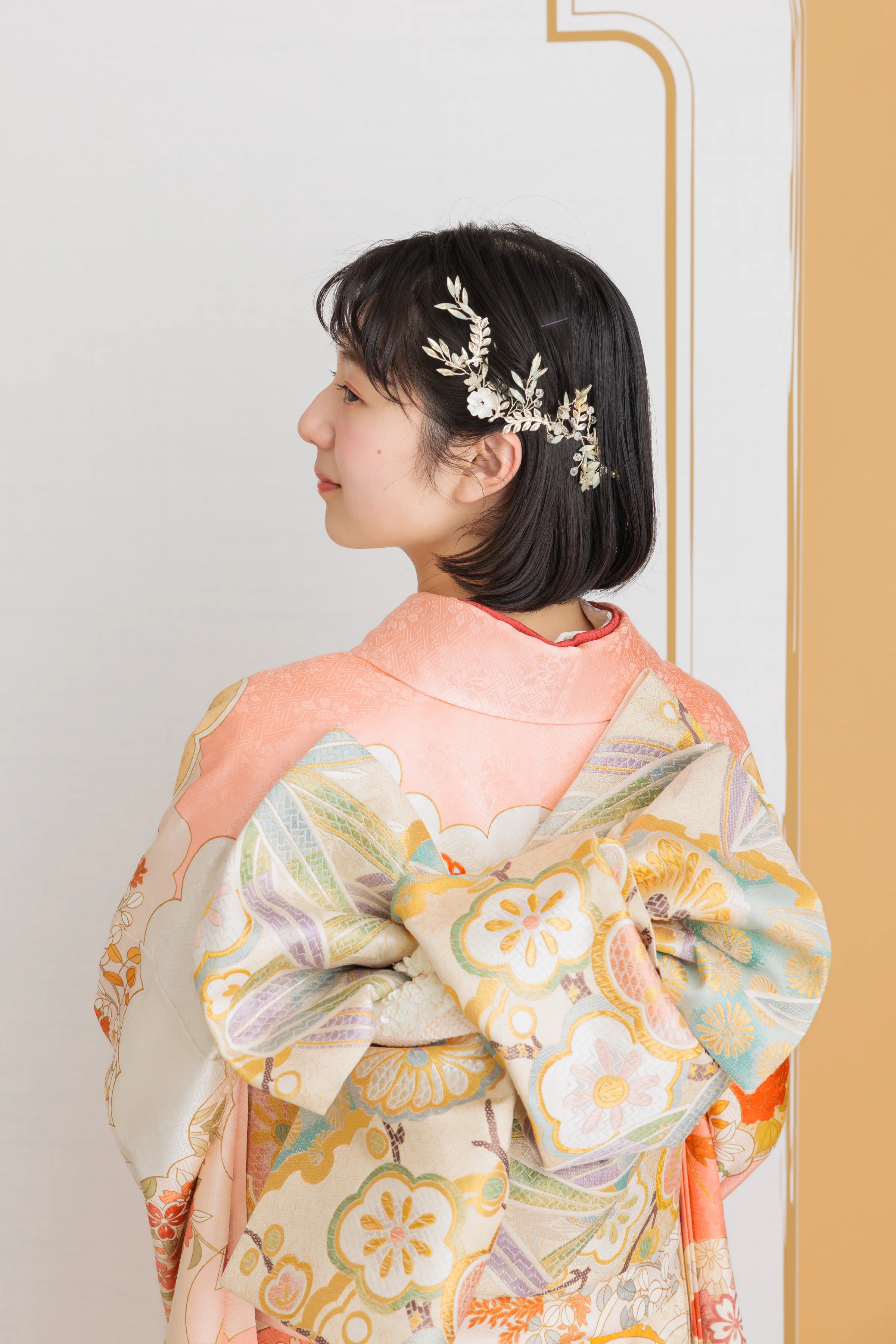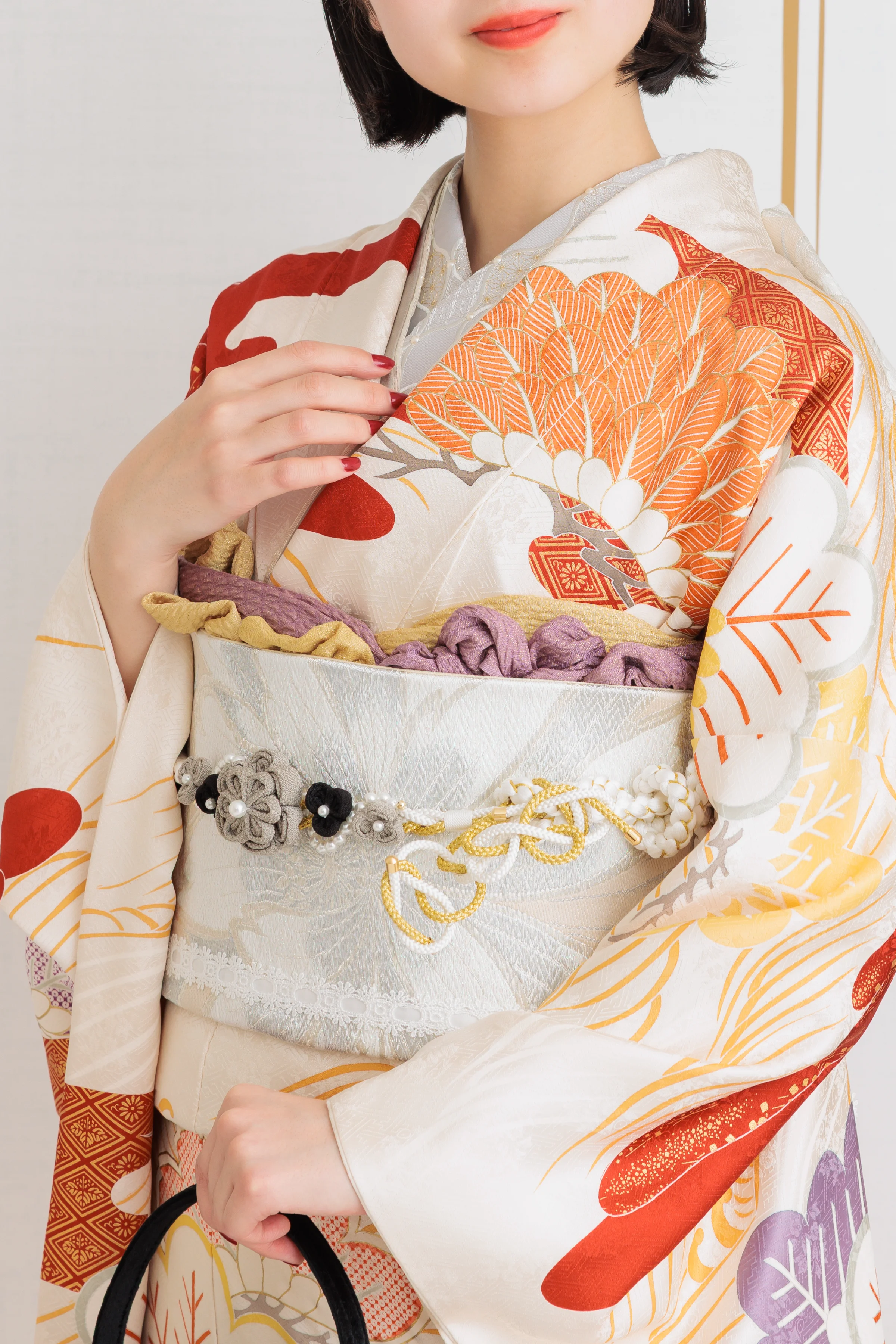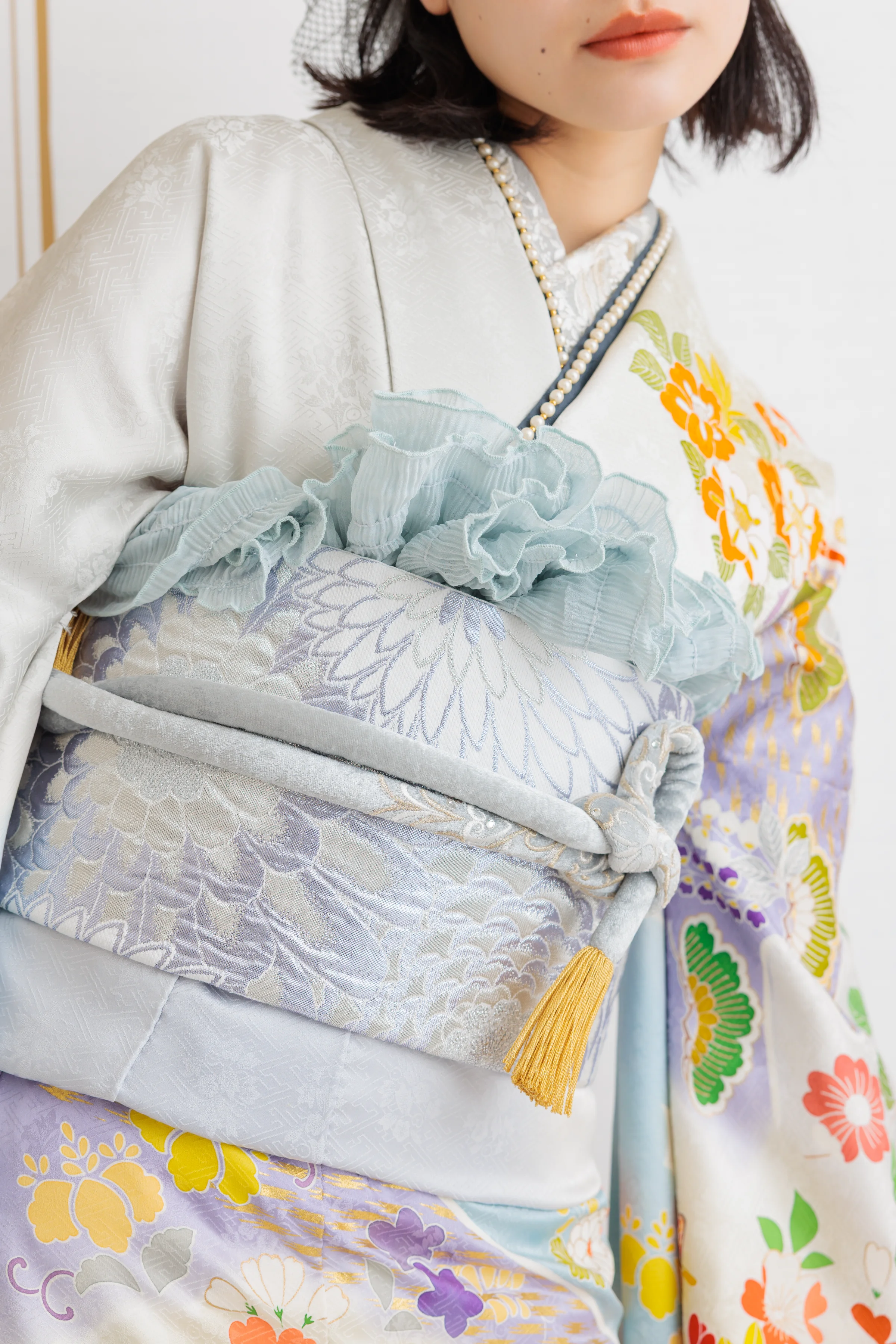後ろ姿をおしゃれに飾る袋帯。アレンジ自在で自分らしい振袖姿が叶います。
