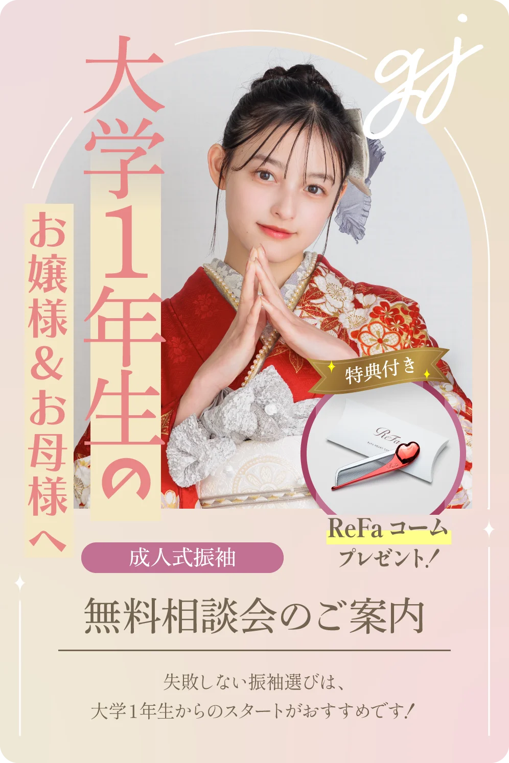 グランジュールなら、一度予約した振袖の変更も大丈夫!早期予約の特典も盛りだくさん!ぜひ、大学1年生の今、無料相談会にお越しください!