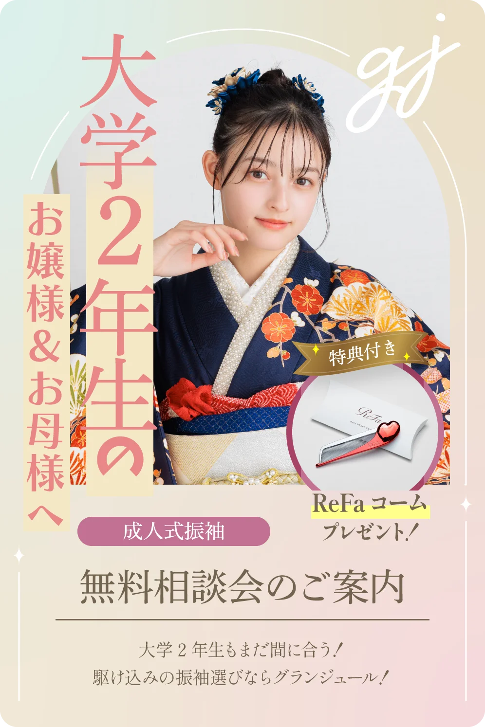 グランジュールなら、一度予約した振袖の変更も大丈夫!駆け込みの方もお選びいただけるようたくさんの振袖をご用意!ぜひ、大学2年生の今、無料相談会にお越しください!