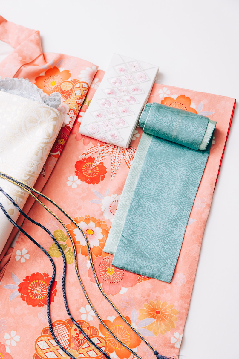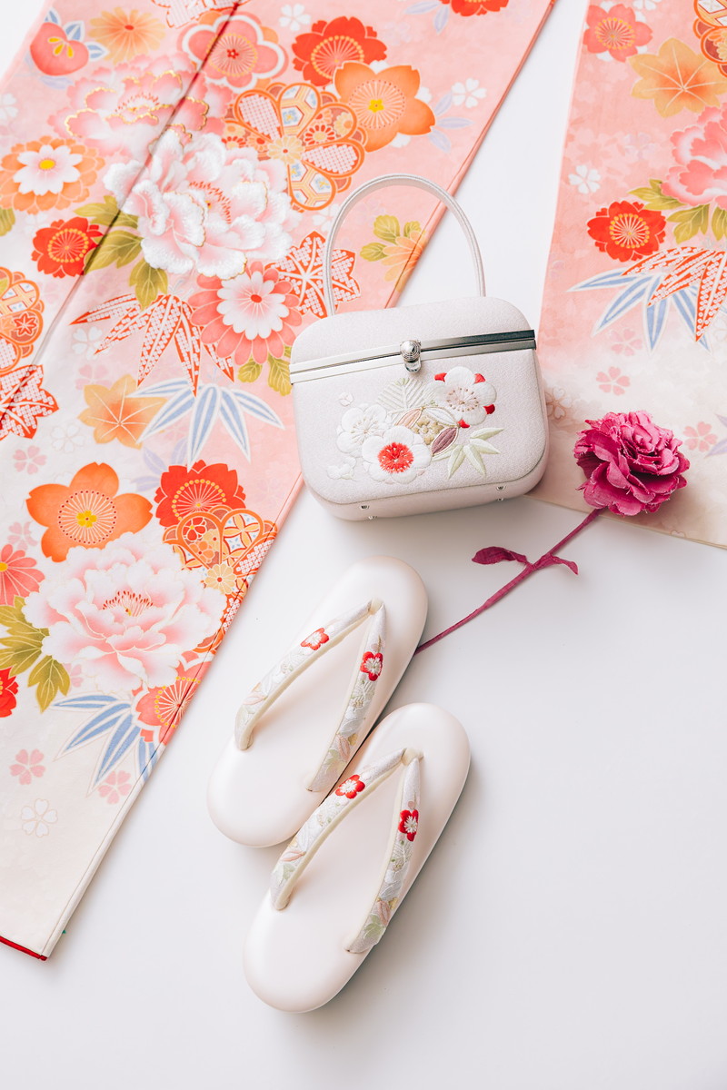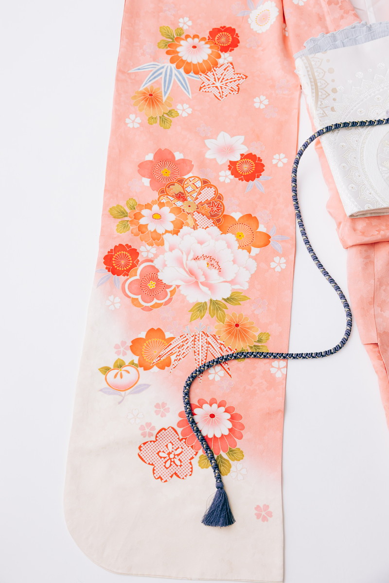 品番 613040 / サーモンピンク地白刺繍牡丹に文様菊