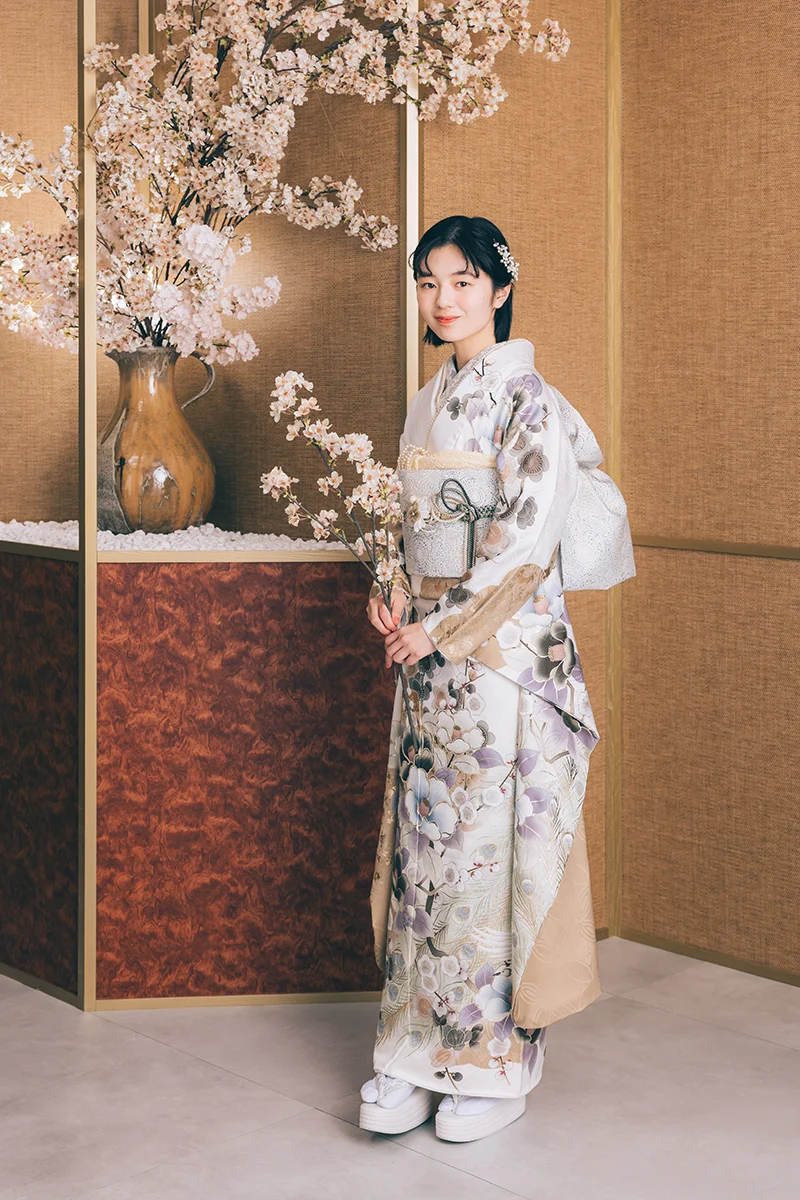 春の訪れを告げる梅と椿が描かれた、やわらかな色合いの振袖。上品で可憐な印象を引き立てる一着です。