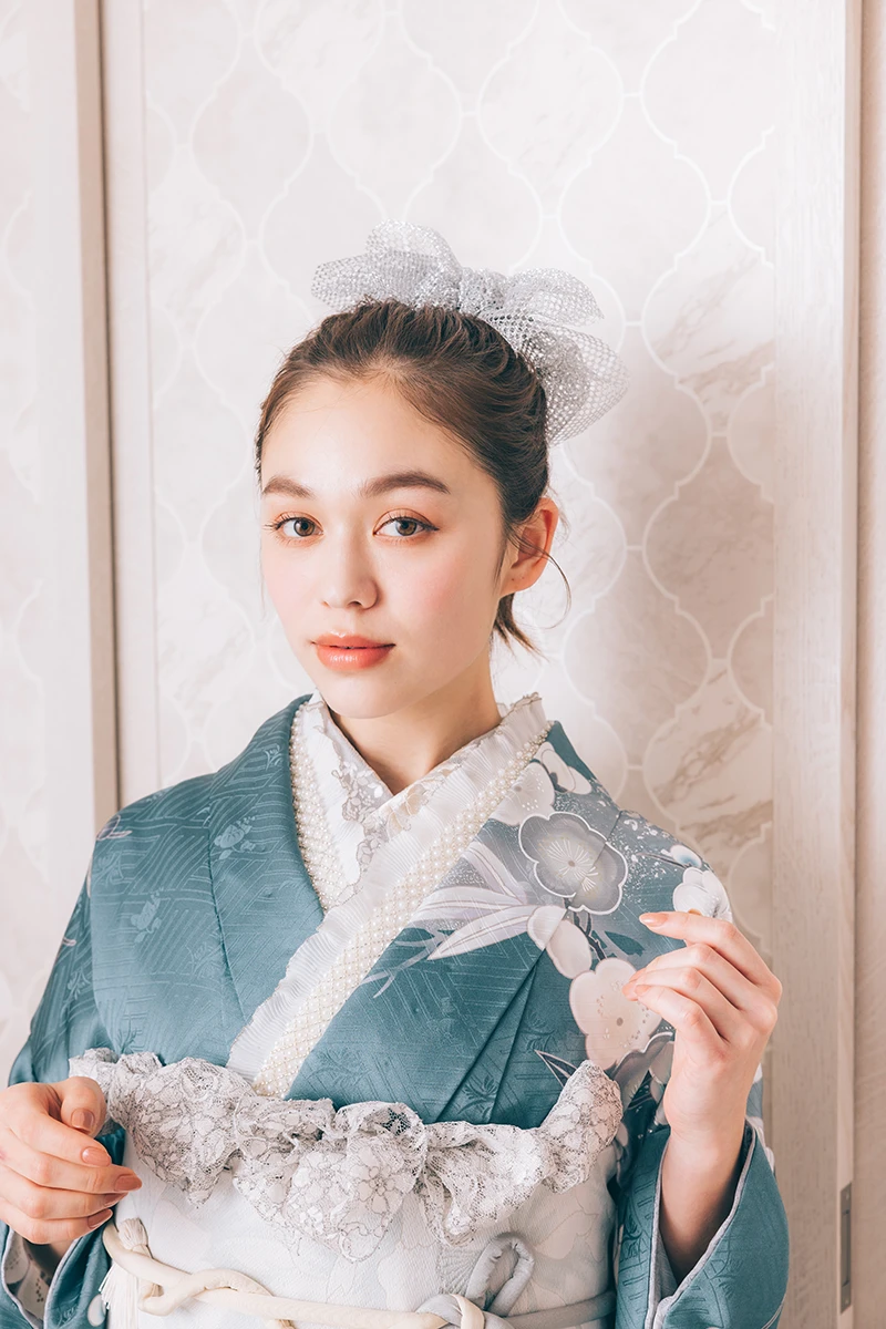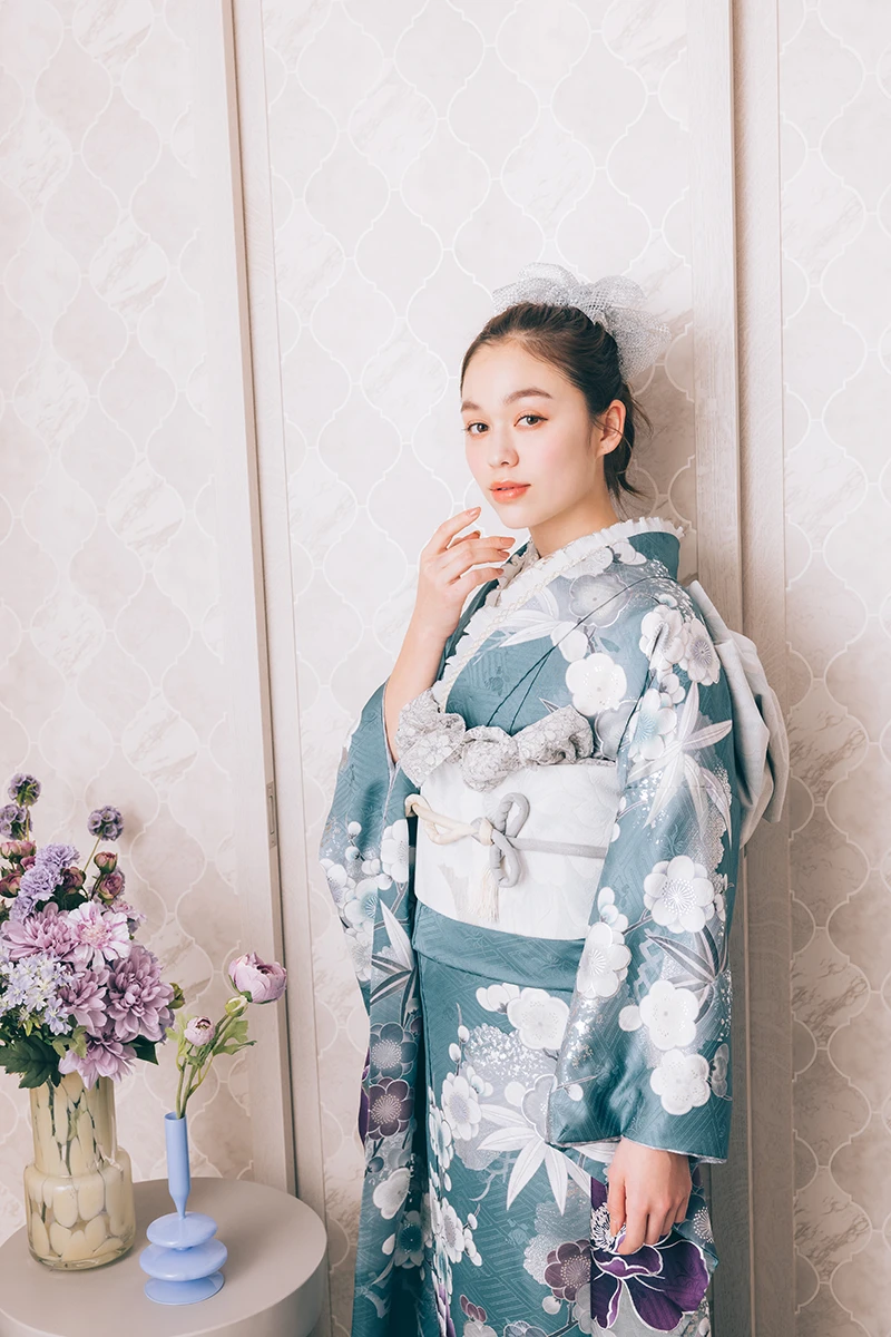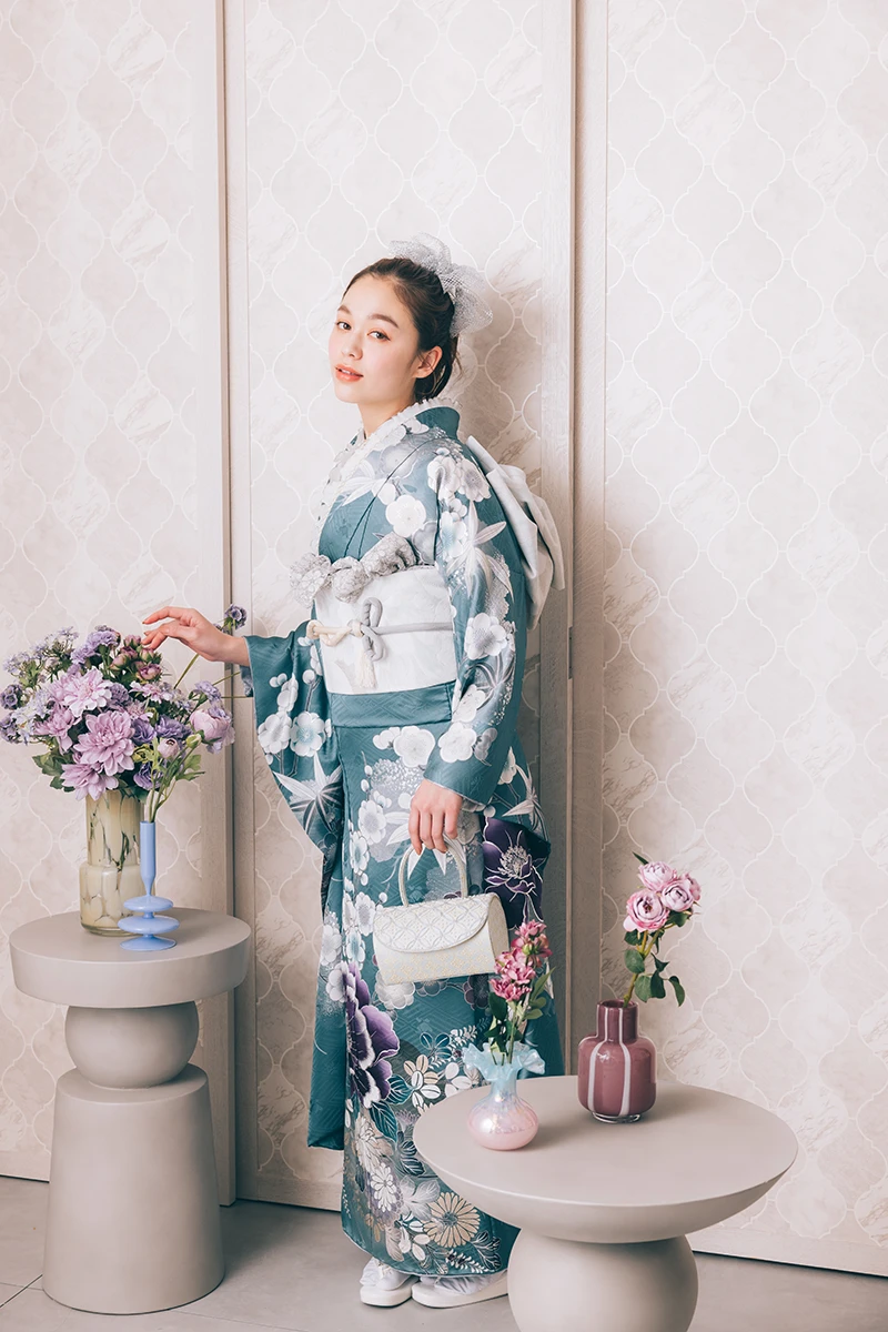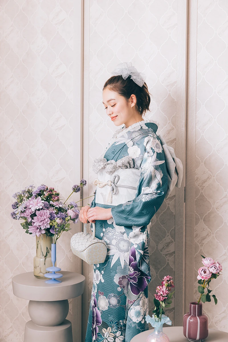 藍ねず色と呼ばれる、青みを帯びたグレイッシュカラーは日本の伝統色のひとつ。花びらに刺繍を施し、立体感と動きのある個性的な一着です。上品で洗練された存在感が際立ちます。
