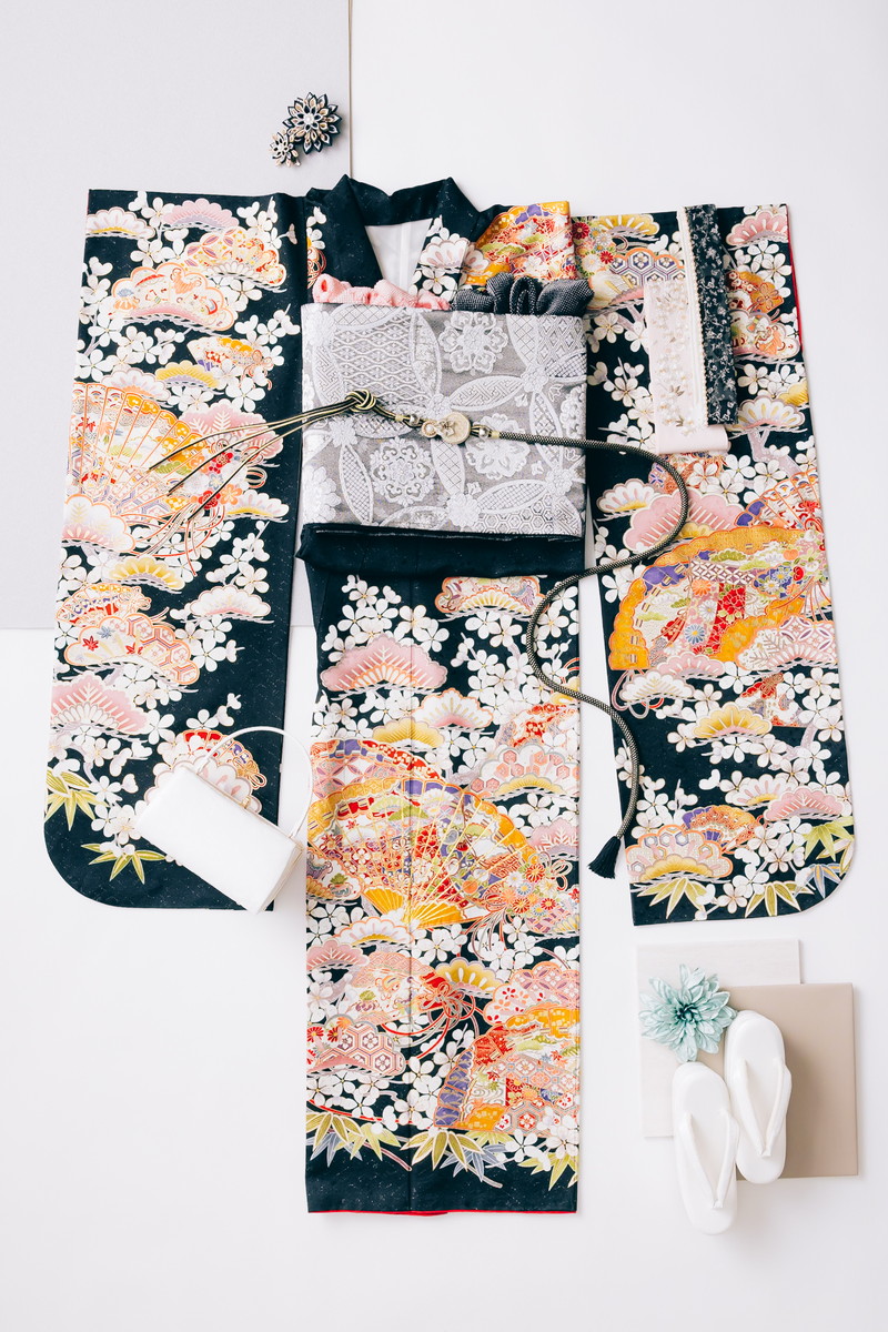 614585 / 黒地雲取り百花桧扇子文重ね