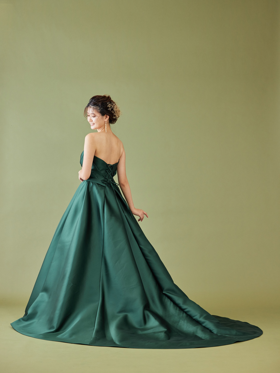 華やかで深みのある色味で大人っぽく落ち着いた雰囲気を引き出したドレス。タックスカートの王道ラインに見頃は構築的なドレープと精巧につくられたビジュー加工をあしらった重圧的なデザインが特徴。