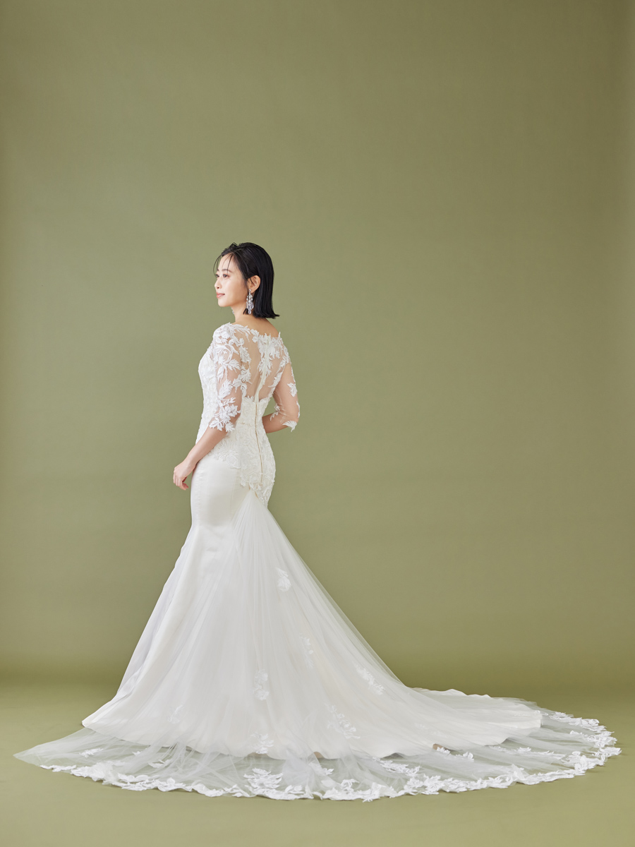 トレーンにも豪華なレースを使用し華麗な女性にぴったりなマーメイドラインのドレスです。
