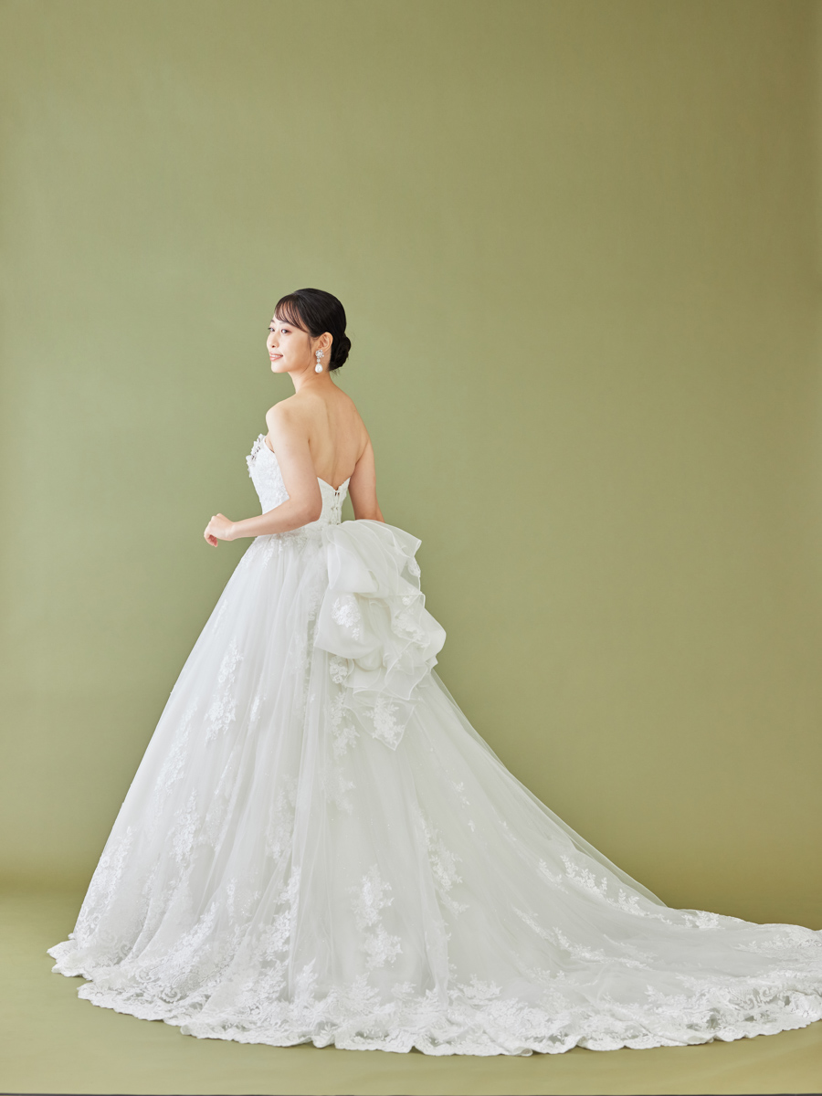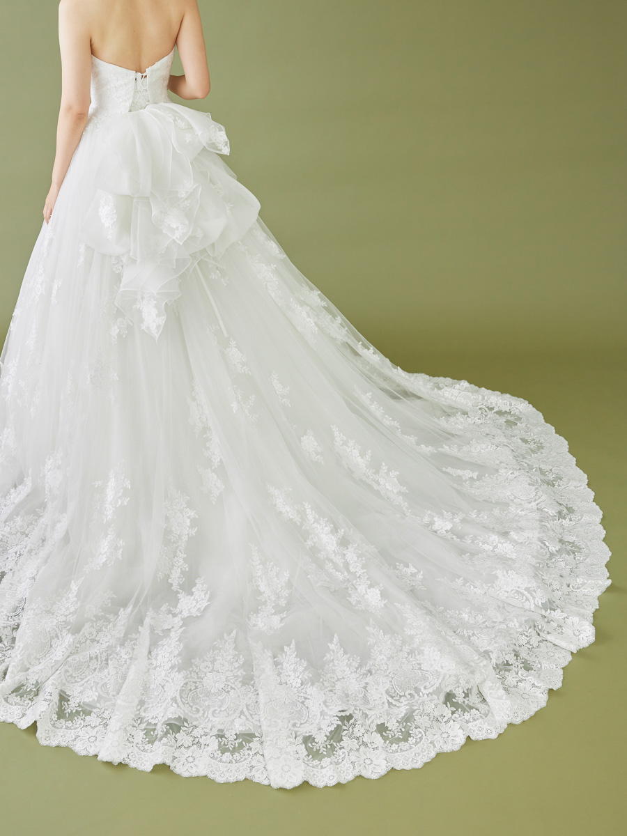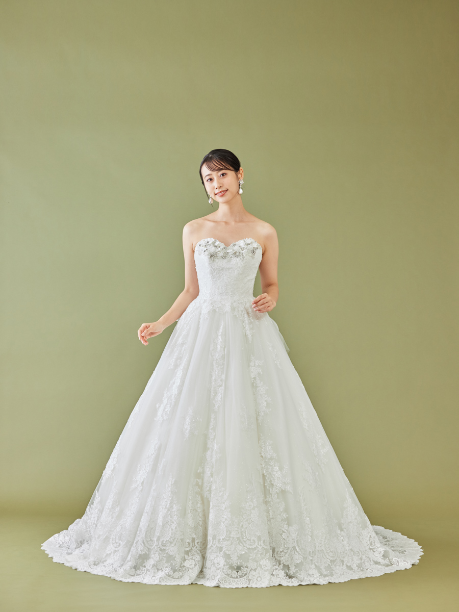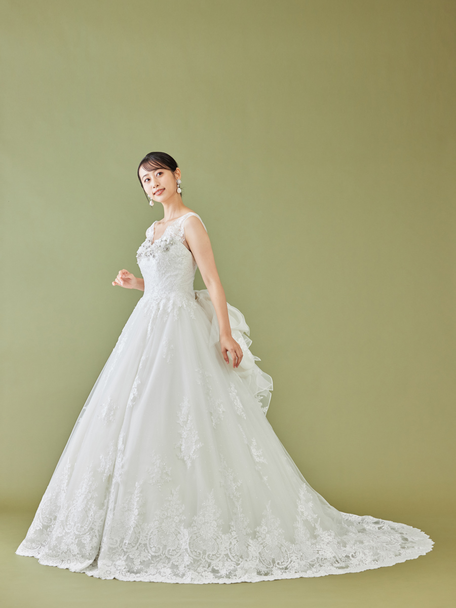 印象的な模様の刺繍レースをふんだんに使用したドラマティックな光を放つドレス。スパンコールとラメチュールの輝きがあいまって、さらに胸元には、ラインストーンやカットビーズ、花びら加工でつくったビジューが特徴。