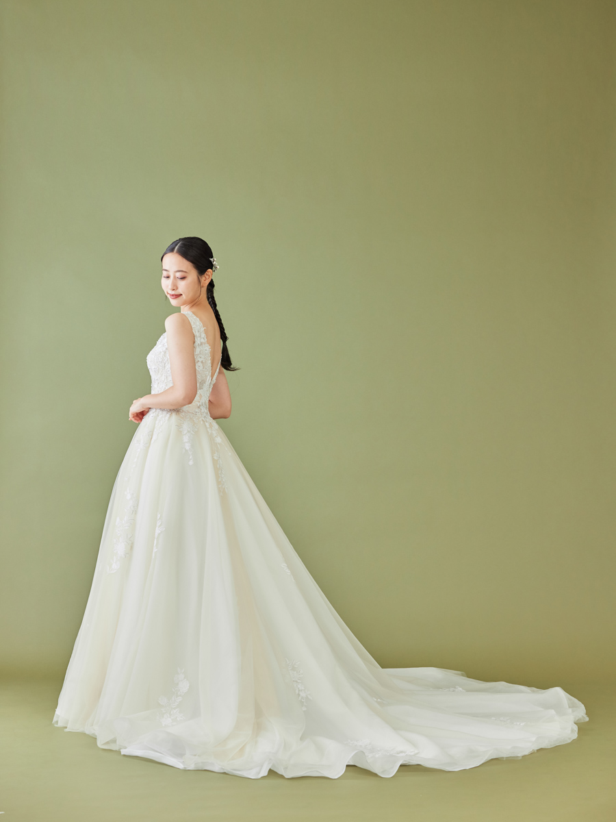 インポートドレスならではのニュアンスカラーや軽やかな空気感をそのままに日本人サイズへパターンアレンジしたドレス。胸元や背中の深い開きは絶妙なVラインをとることで着用しやすいパターンにこだわりました。ライトゴールドとホワイトをミックスしたレースやビーディングがトレンド感あるお洒落な一着。