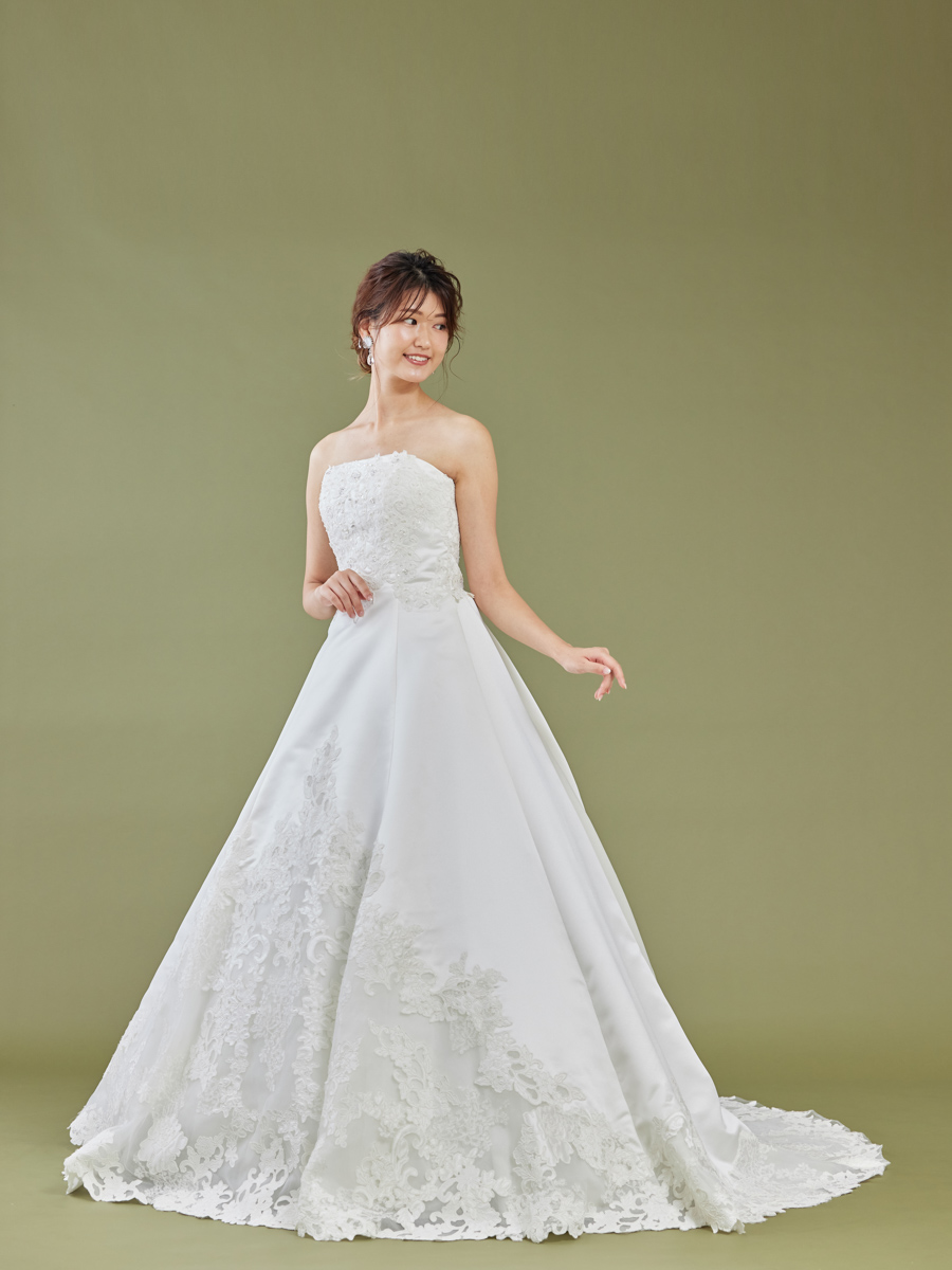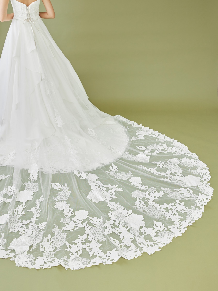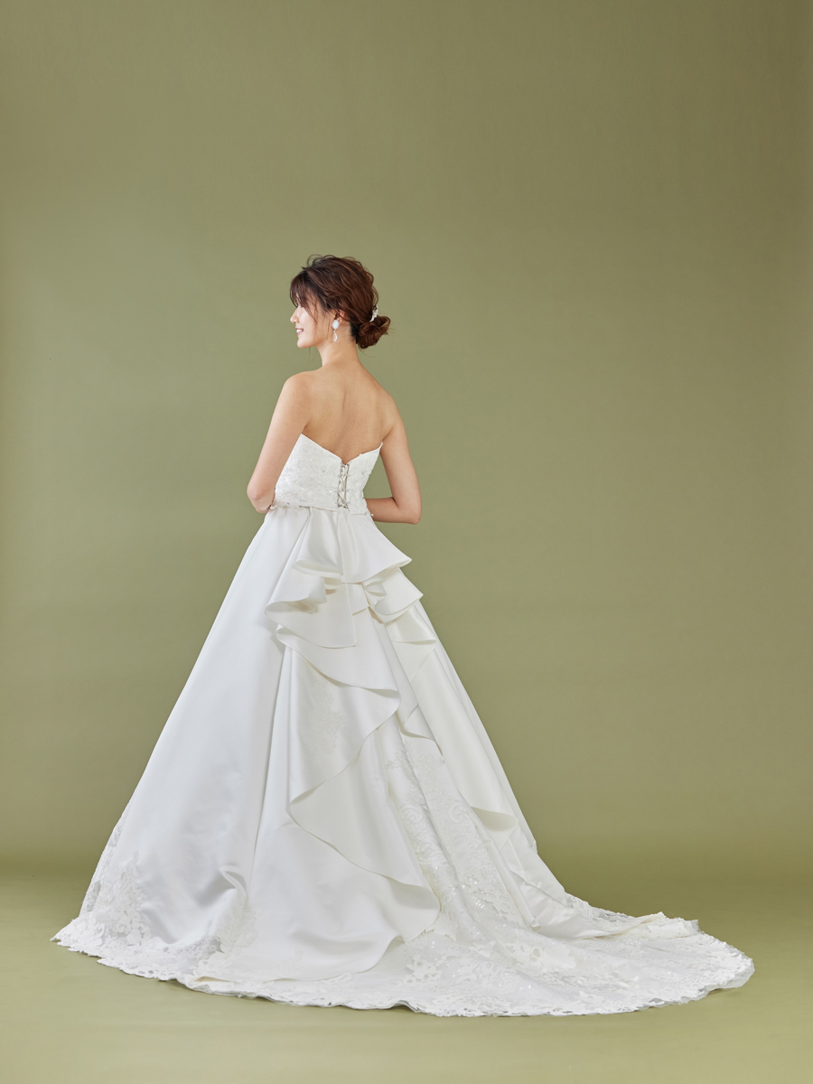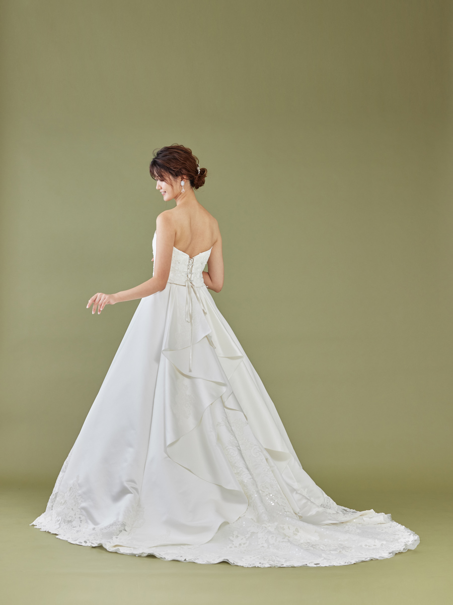 上質な質感のサテンであしらったカットワークとエンブロイダーの2種類のレースをチュールで透かせたドレス。取外しのロールカラーは上品でクラシックな装いですが、背中は大胆に開けて魅せるトレンドも組み合わせた新しい王道デザインのウェディングドレス。