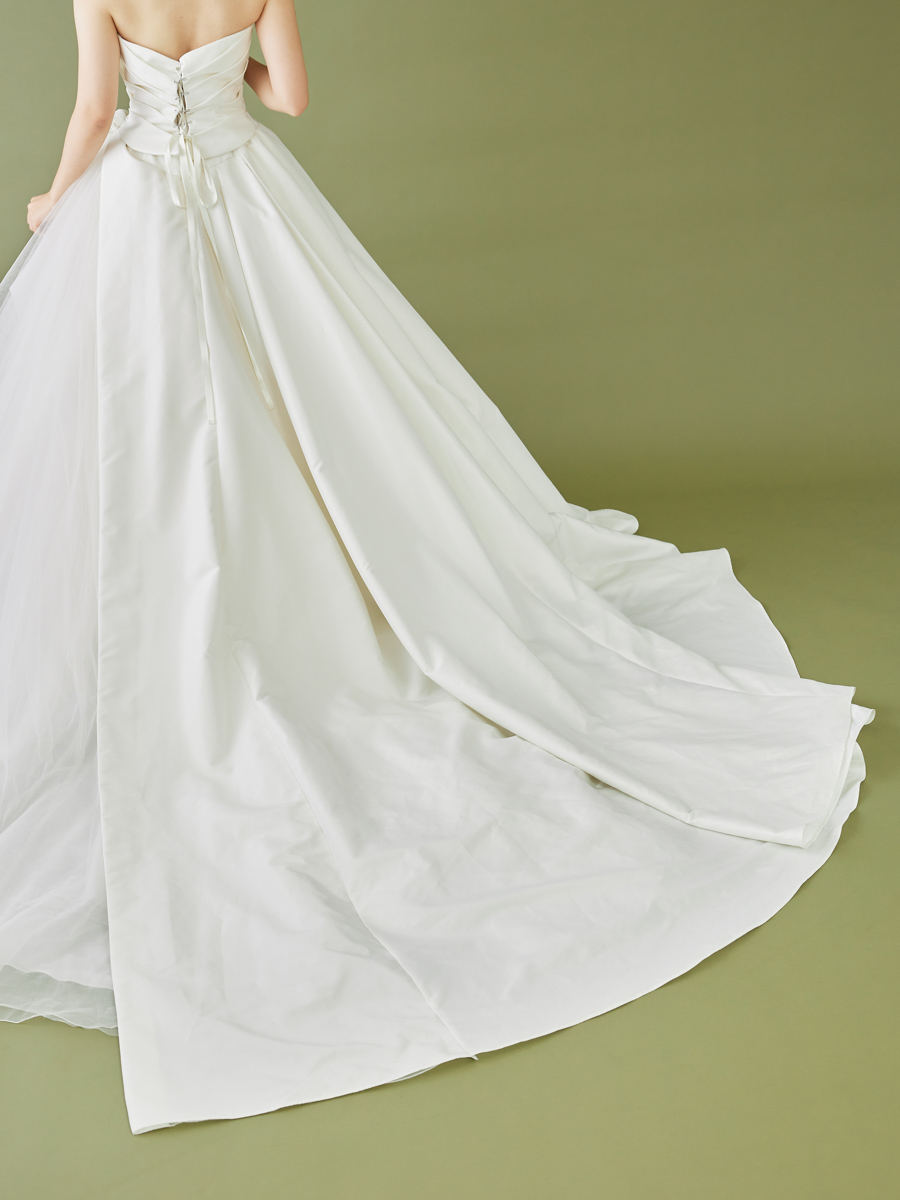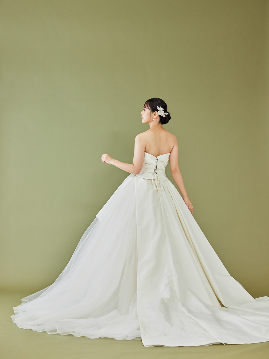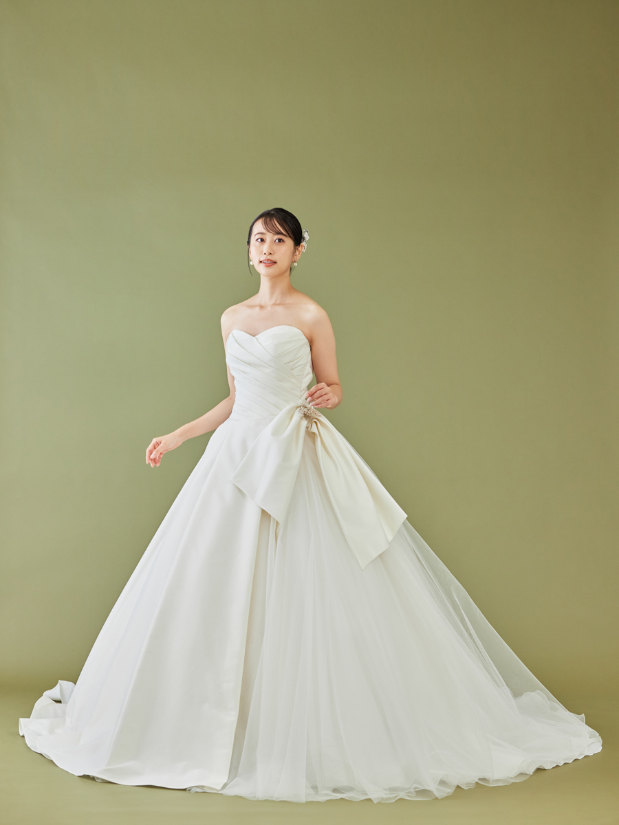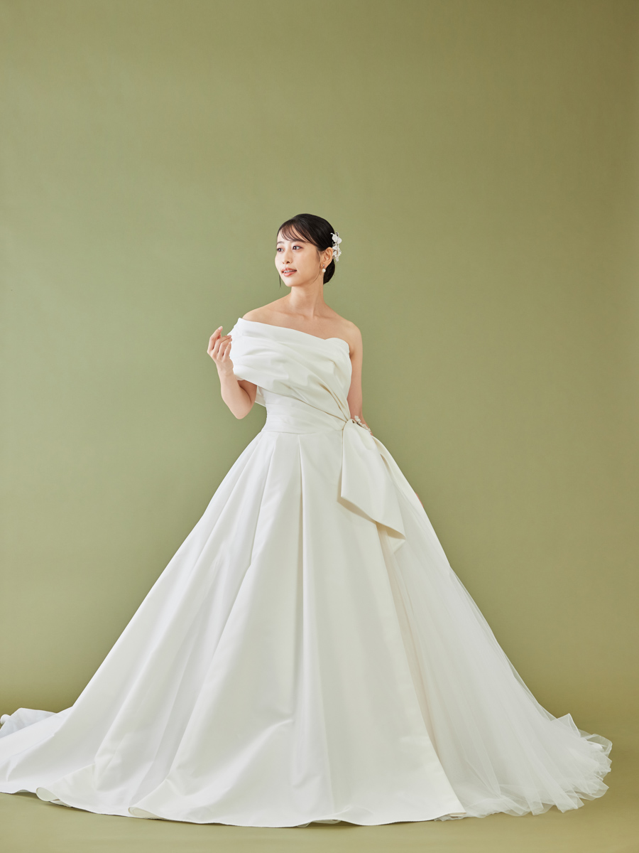 ミカド素材のドレープでできたアシンメトリーのケープが大きめなリボンと繋がり、海外の皇室をプリンスを思わせるドレス。ケープを外すと斜めのドレープが身頃を包むすっきりとしたドレスに変わります。