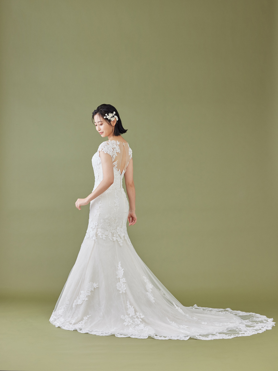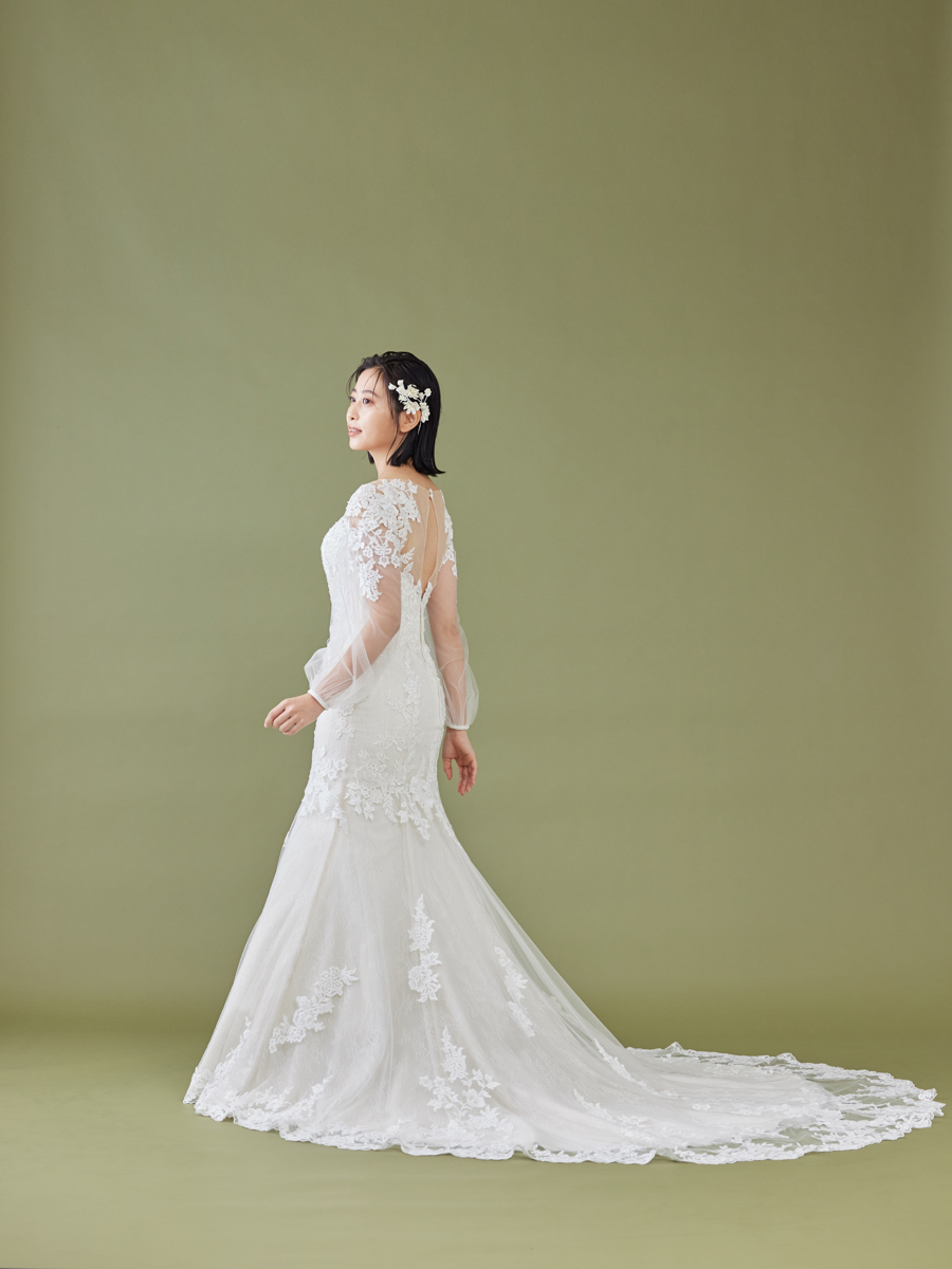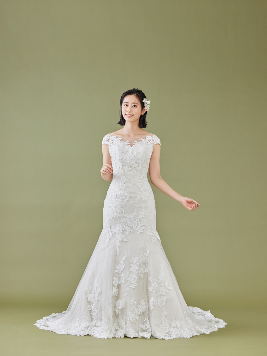 膝で絞り込まないソフトマーメイドのシルエットが優美なドレス。立体的なレースを引き立たせる繊細なレースとほんのりしたピンクを重ねています。取り外し可能なふんわりスリーブで異なる印象に変化するデザインが特徴。