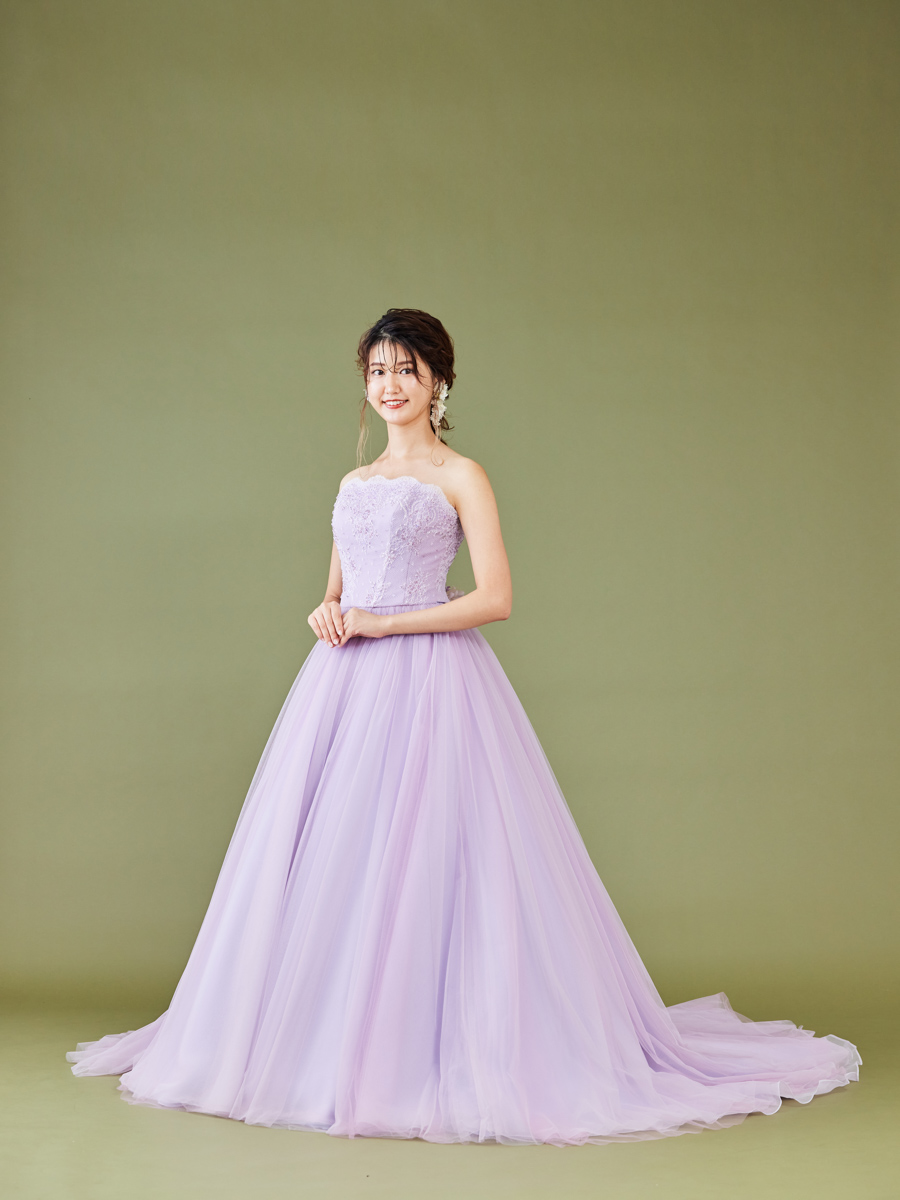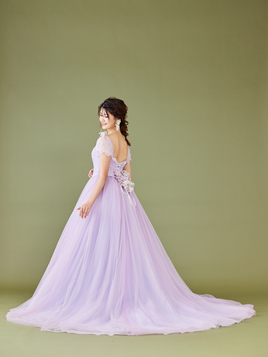 淡い紫のドレスは花のライラックをイメージ。無垢な花嫁にぴったりな純真で可憐な佇まいです。身頃のシャンテリーレースは繊細に仕上げ、袖のキャップスリーブは上品に可憐さを添えます。