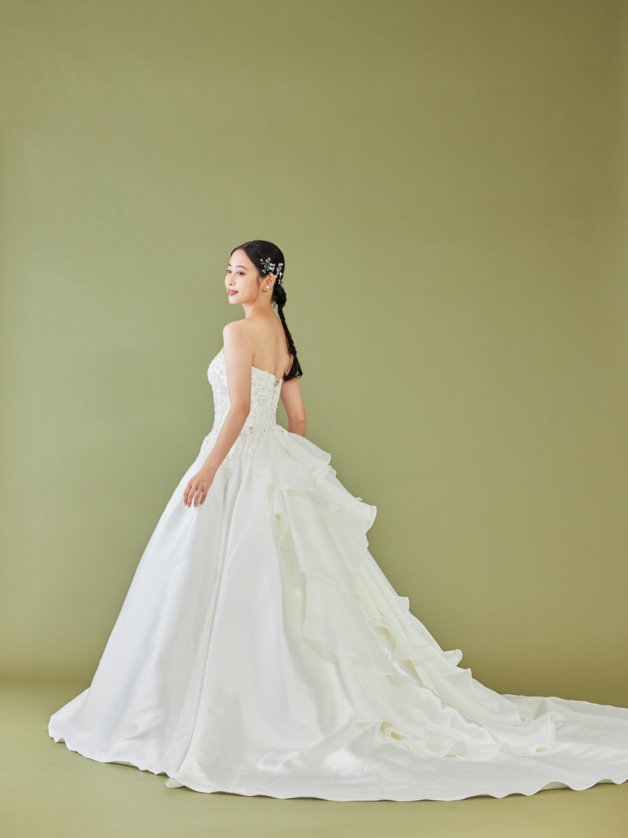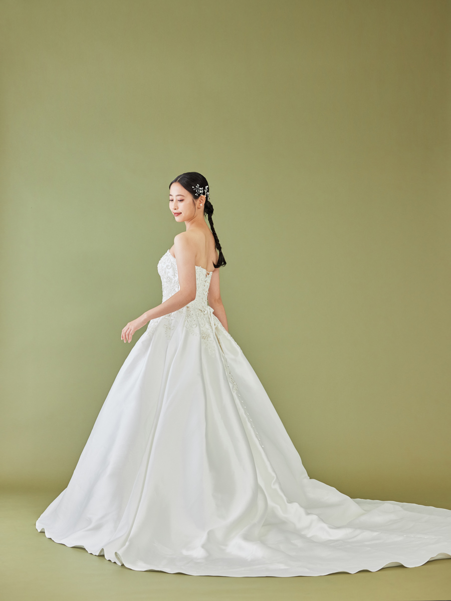 大ぶりなシルエットが特徴の王道ドレス。身頃とスカートのレース使いがスタイルアップ効果抜群。女性のスタイルをより美しく見せてくれるデザイン。数パターンのスタイルがアレンジ可能。小物使いで花嫁のご希望を最大限に演出します。
