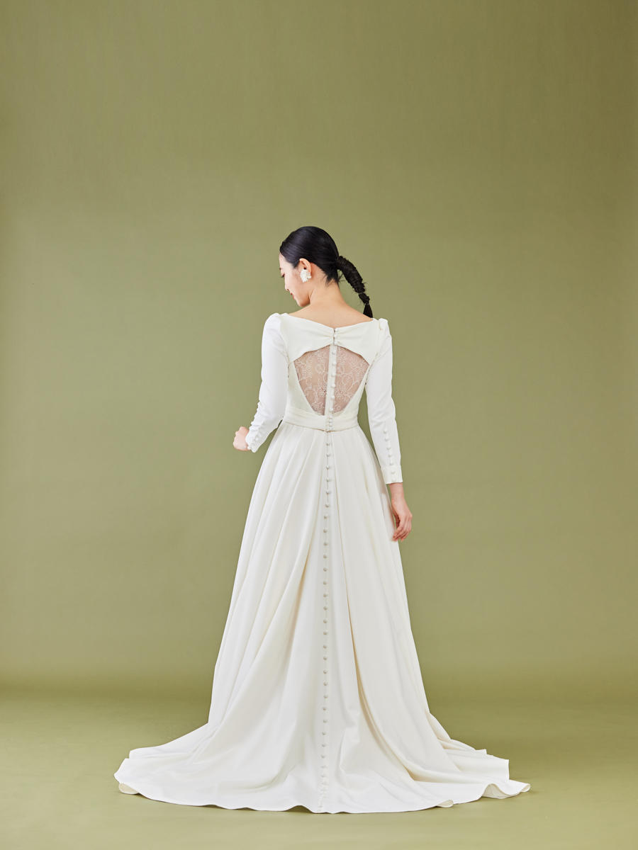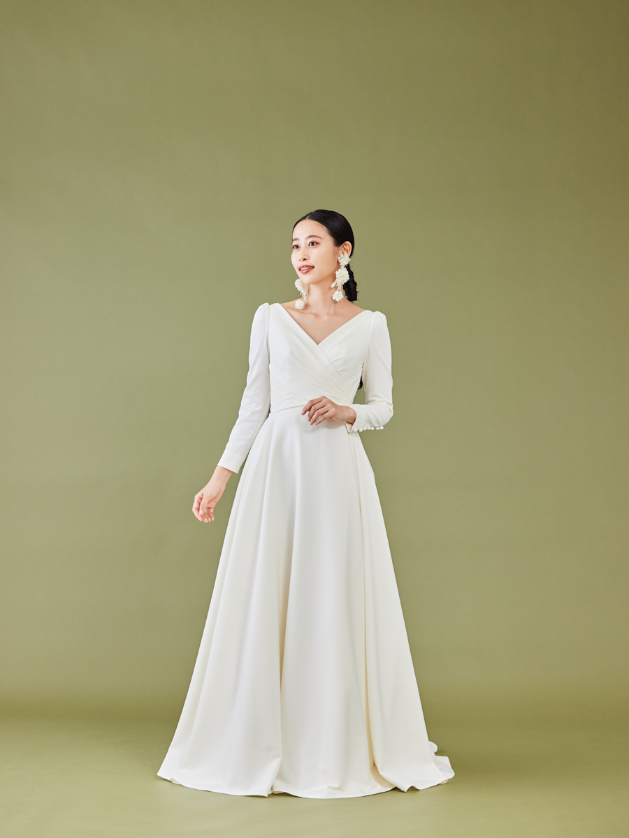 百合の花をイメージしたドレス。前身頃のクロスオーバーがウエスト位置を高く見せ、足長効果でスタイルアップ。深めのVネックと背中に施したレースからの肌の透け感がより女性らしい美しさを引き出します。体に程よくフィットするストレッチ素材を使用することでロイヤルな雰囲気を残しつつ、すっきりとモダンな印象のウェディングドレス。