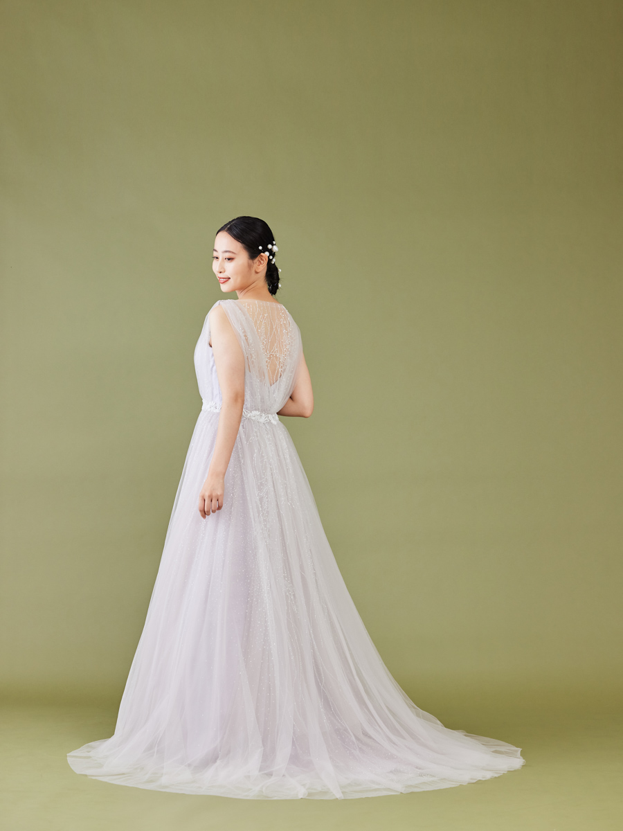水泡のような縦ラインに特徴のあるインド刺繍がデザインされたラグジュアリーな一着。スレンダーシルエットでも装飾で華やかさを十分に感じられるので、幅広いシーンで着用いただけます。2種類のキラキラ感を表現するために、ビジュー加工とグリッター加工をMIX。360度どこから見ても上品な輝きです。