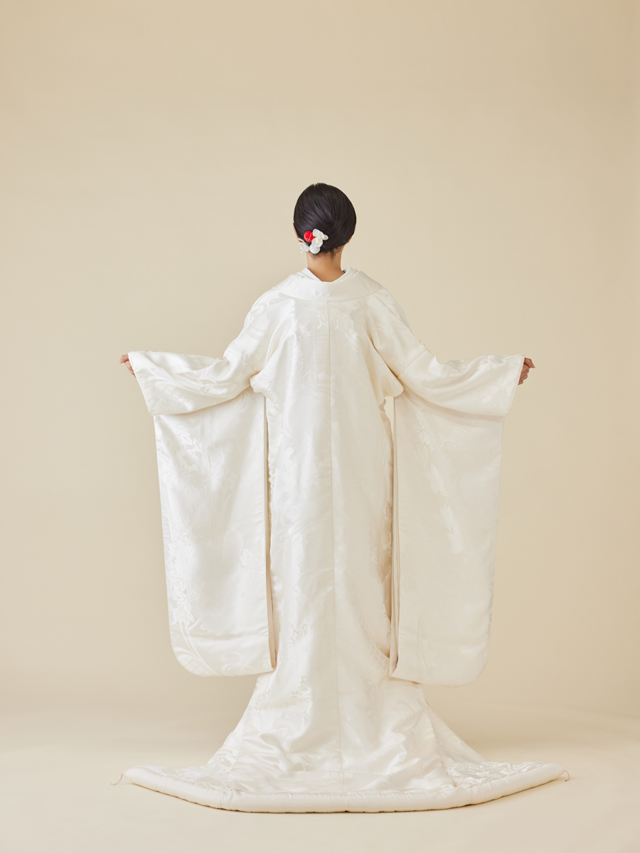 牡丹文様、杜若(かきつばた)文様、椿文様など四季花文様が存在感豊かに光沢ある白糸を使って織り出された錦織の打掛。製作段階において、一般的な織物打掛よりも高度な技術が要される総絵羽合わせのこの打掛は、豪華さと気品を持ち合わせた打掛です。