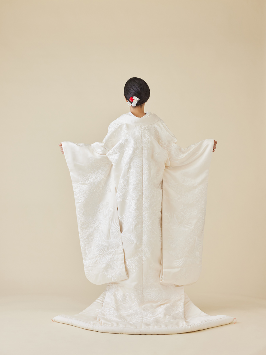 大胆な熨斗が一面に描かれた、この上なく華やかな白無垢です。絵柄は全て総刺繍となっており、ダイナミックで格調高い逸品です。翔鶴と四季の花々もあしらわれ晴れの日を豪華に彩ります。