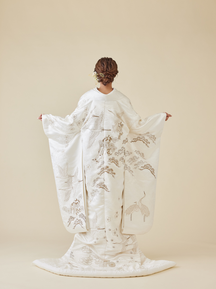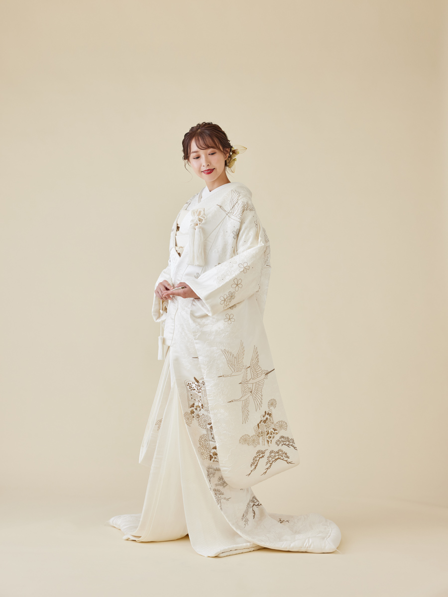 金糸の刺繍で施された鶴が印象的な白無垢。白地刺繍の御所車・桜の文様が上品にひきたつ一着。シンプルながらも存在感を醸し出します。