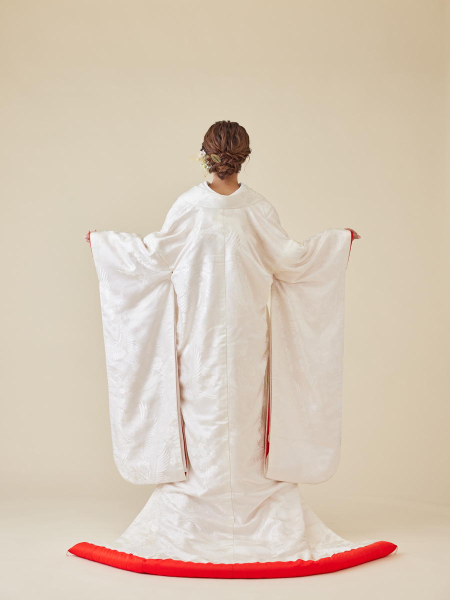 赤い裏地が袖やふきにちらりと見えるふき赤の白無垢は、キリッと引き締まりお洒落な印象を与えます。真っ赤な紅(口紅)がとてもよく似合います。『赤』という色は生命力を表す色。その色を身に着けることにより、未来へとつながる強い生命力を得られることからお祝い事には人気のカラーです。赤ふきの白無垢にも、そんな想いが込められています。