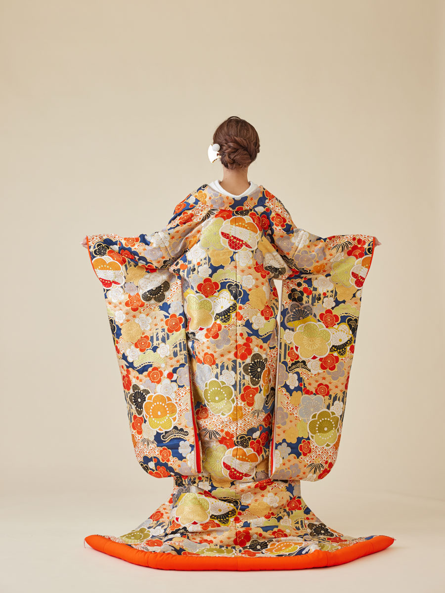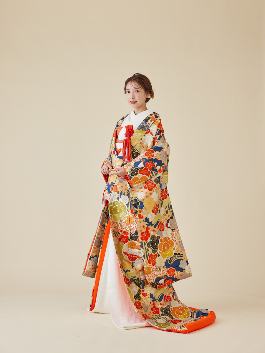 紺地で凛と引き締まった古典柄の色打掛です。松竹梅の柄は、吉祥文様という晴れ着に用いられる縁起のよい柄です。幾重にも重なった梅の柄と、フキの朱色が非常に華やかです。