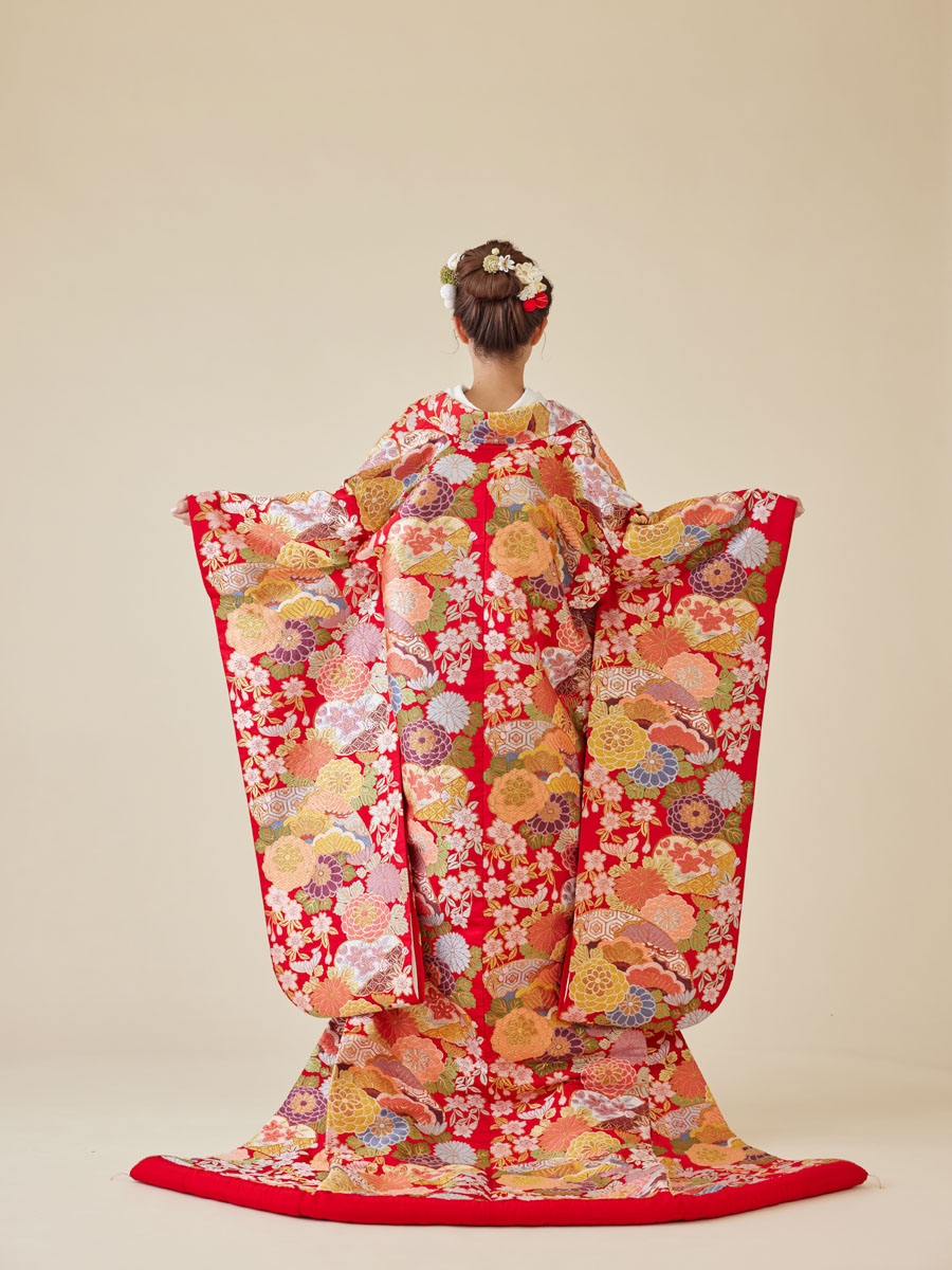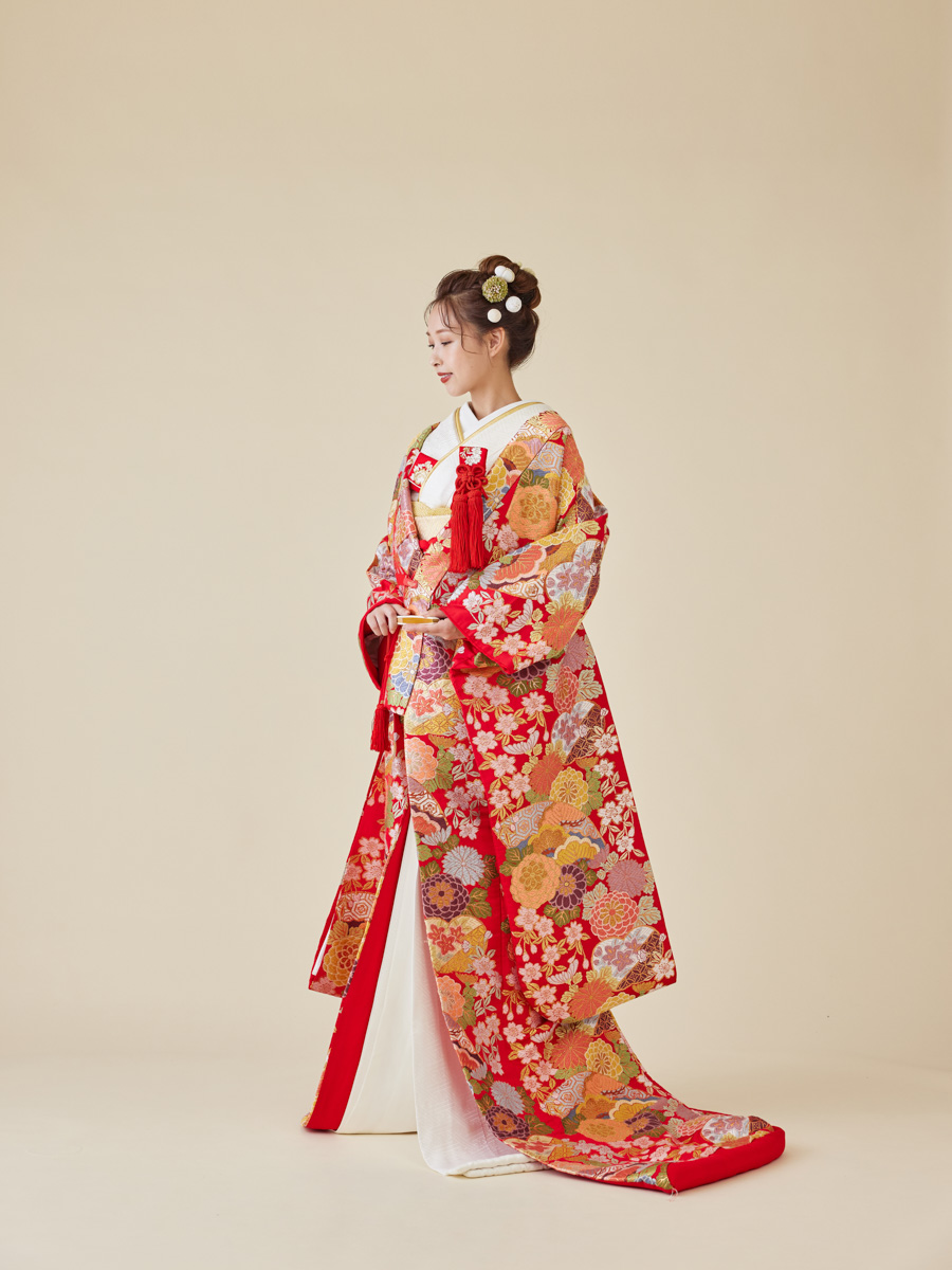 披露宴での花嫁を、よりあでやかに装う赤地の織物打掛。美しく織り上げた赤地に、文様を中に描いた扇面文様と団扇文様、日本を代表する花「桜」と「菊」の文様をふんだんに重ねた華やかな逸品。洗練された豪華さが幸せな感動とよろこびを与えてくれます。